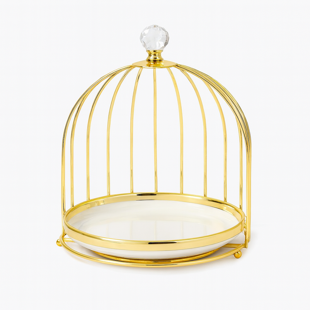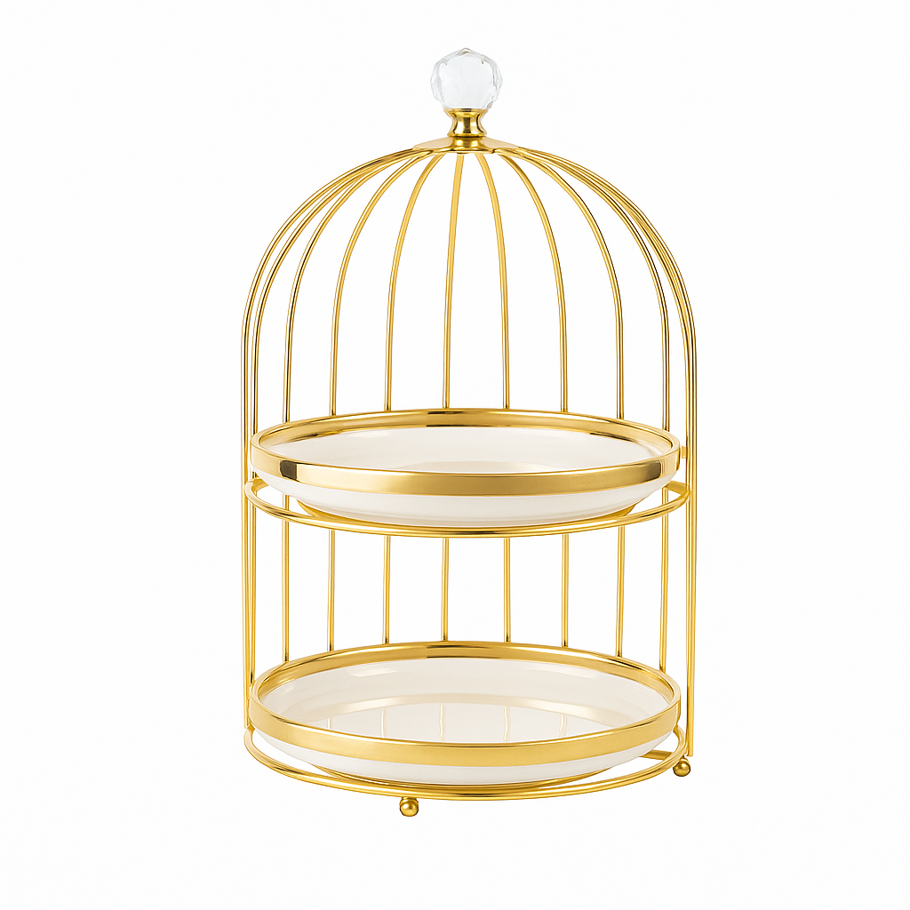 Showcase your desserts in luxury with this Birdcage Style Gold Pastry Stand, available in 1-tier and 2-tier options. Crafted with a gold-finished frame and a premium white plate with gold edging,