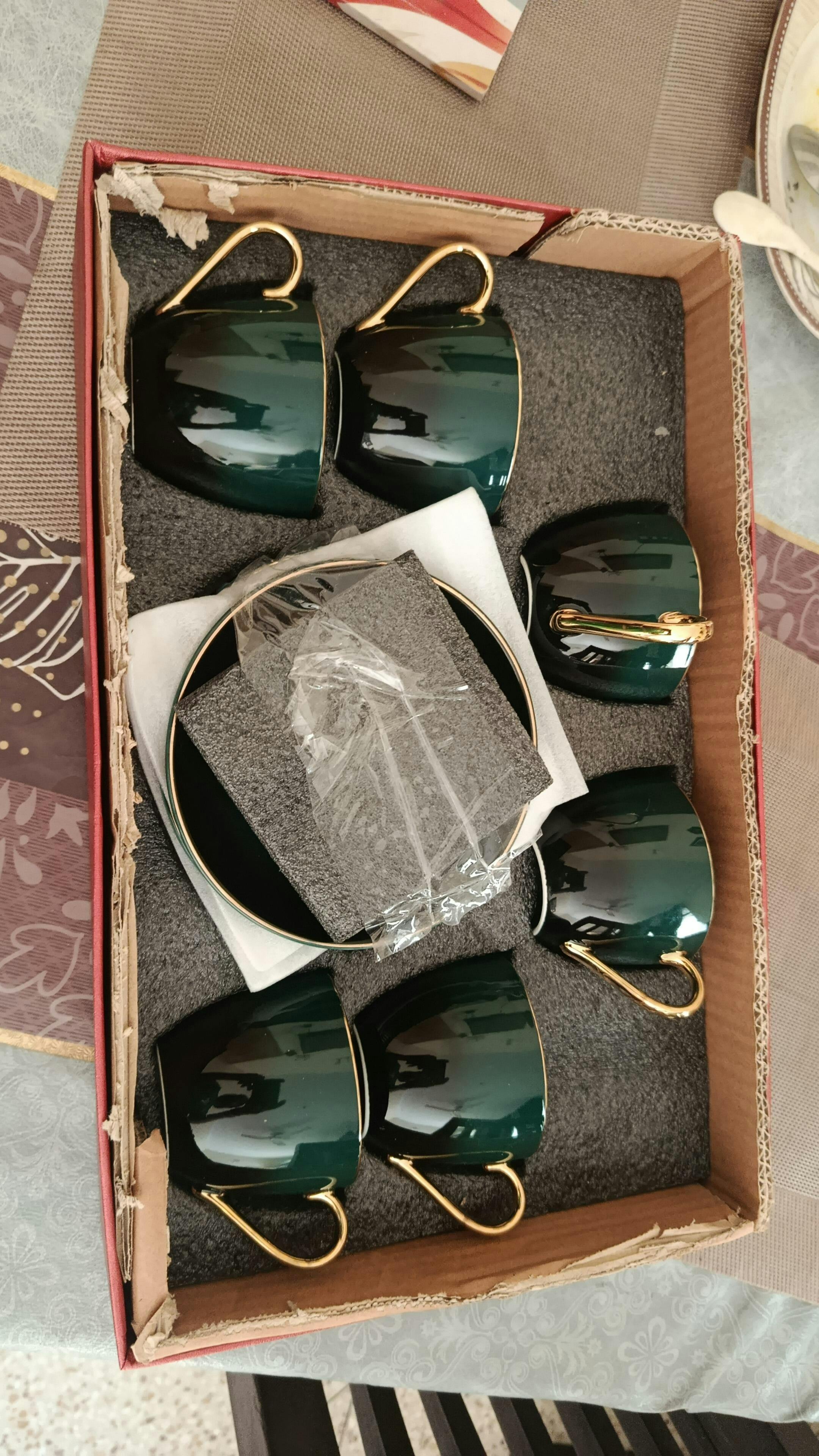 Add elegance to your tea or coffee time with this 6-person, 12-piece cup and saucer set. Featuring a deep emerald green and black design accented with gold rims and gold handles, this set brings a refined and timeless charm to your table. Each cup is paired with a matching saucer, making it ideal for hosting guests, family gatherings, or simply enjoying your favorite hot beverage in style.