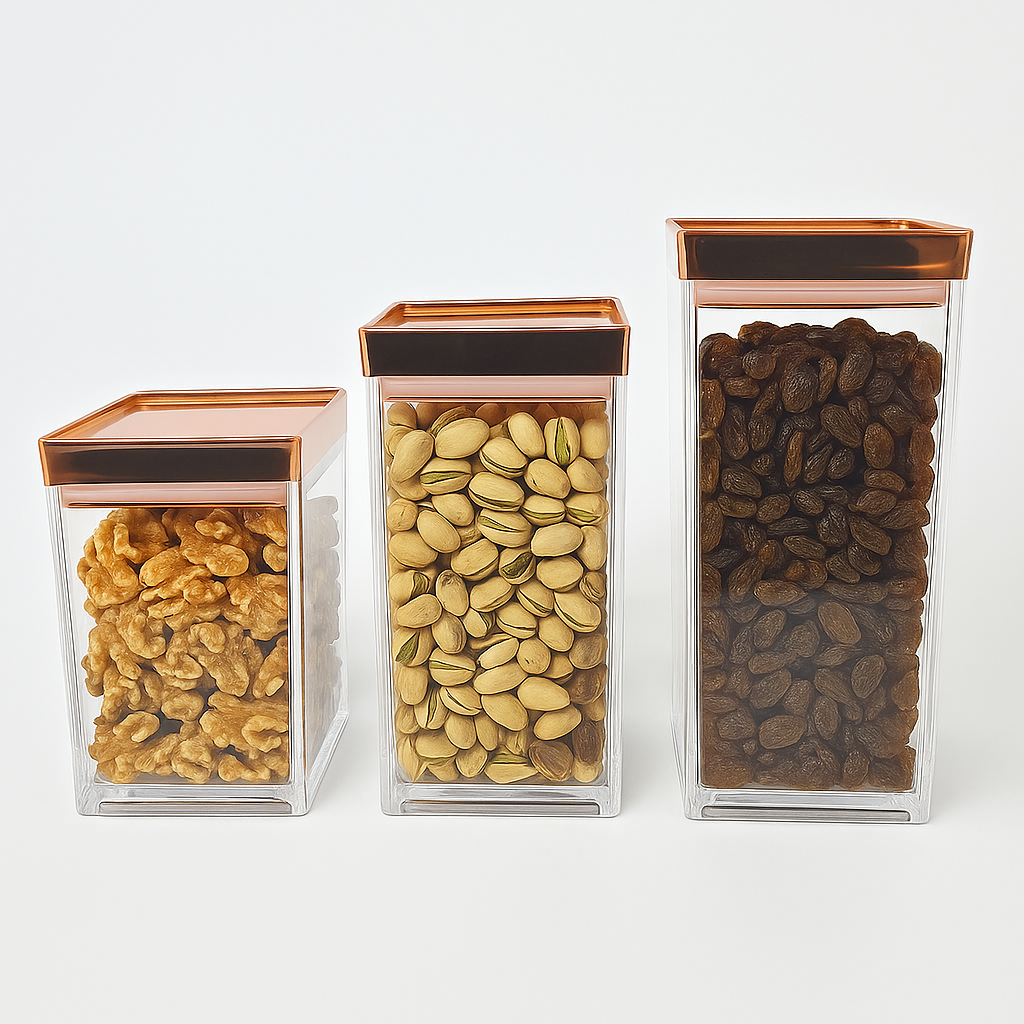 Organize in style with the Acrylic Jar Single Piece, available in small, medium, and large sizes. Made from durable, crystal-clear acrylic and topped with a sleek rose gold lid, these jars add a modern and luxurious touch to any kitchen or dining space. Perfect for storing dry fruits, chocolates, candies, pulses, or everyday pantry items, they combine practicality with elegance.