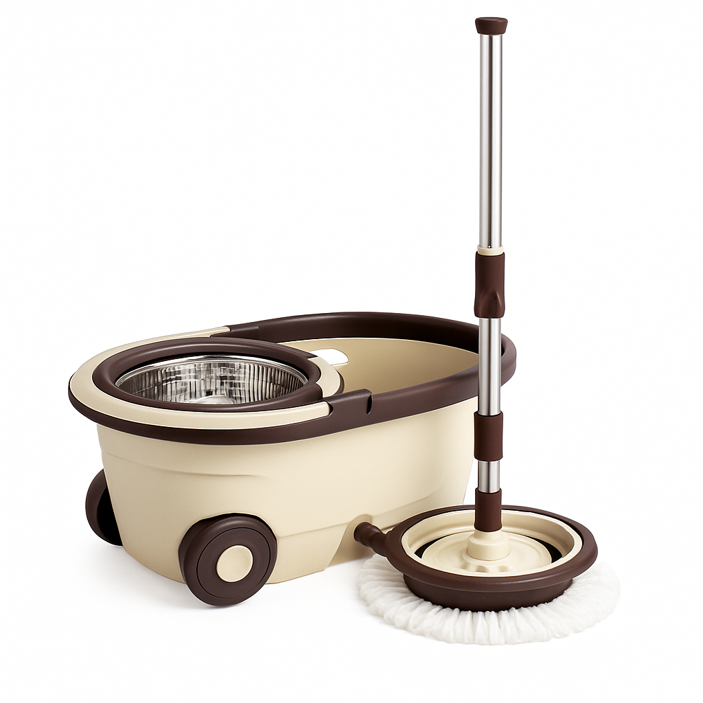 A convenient magic spin mop set designed with a wheeled bucket for easy movement and hassle-free cleaning. The 360° rotating mop head reaches corners, under furniture, and tight spaces, while the spinning basket efficiently dries the mop with minimal effort.