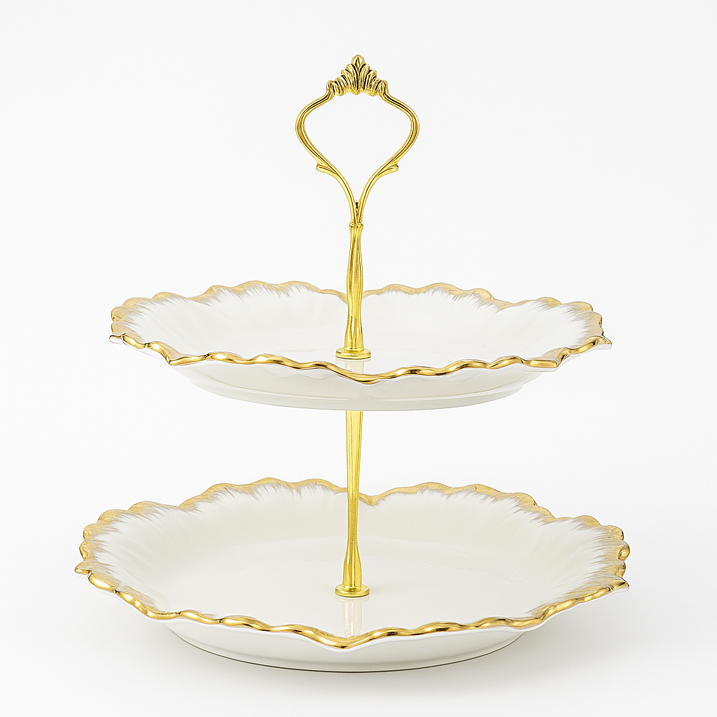 Add timeless elegance to your table with this 2-Tier Pastry Stand, featuring beautifully scalloped plates with gold detailing and a luxurious gold handle. Perfect for serving pastries, cupcakes, fruits, or finger foods,