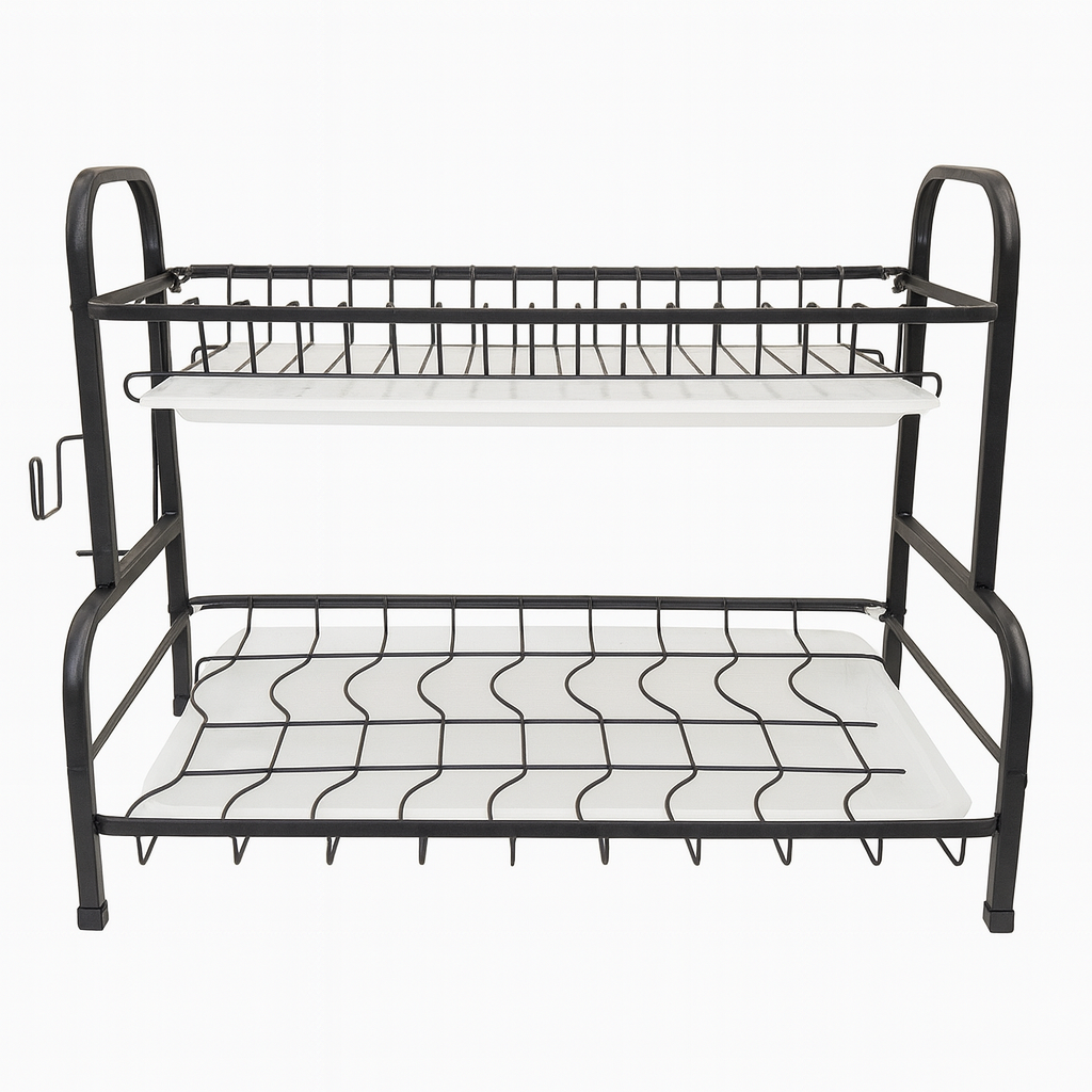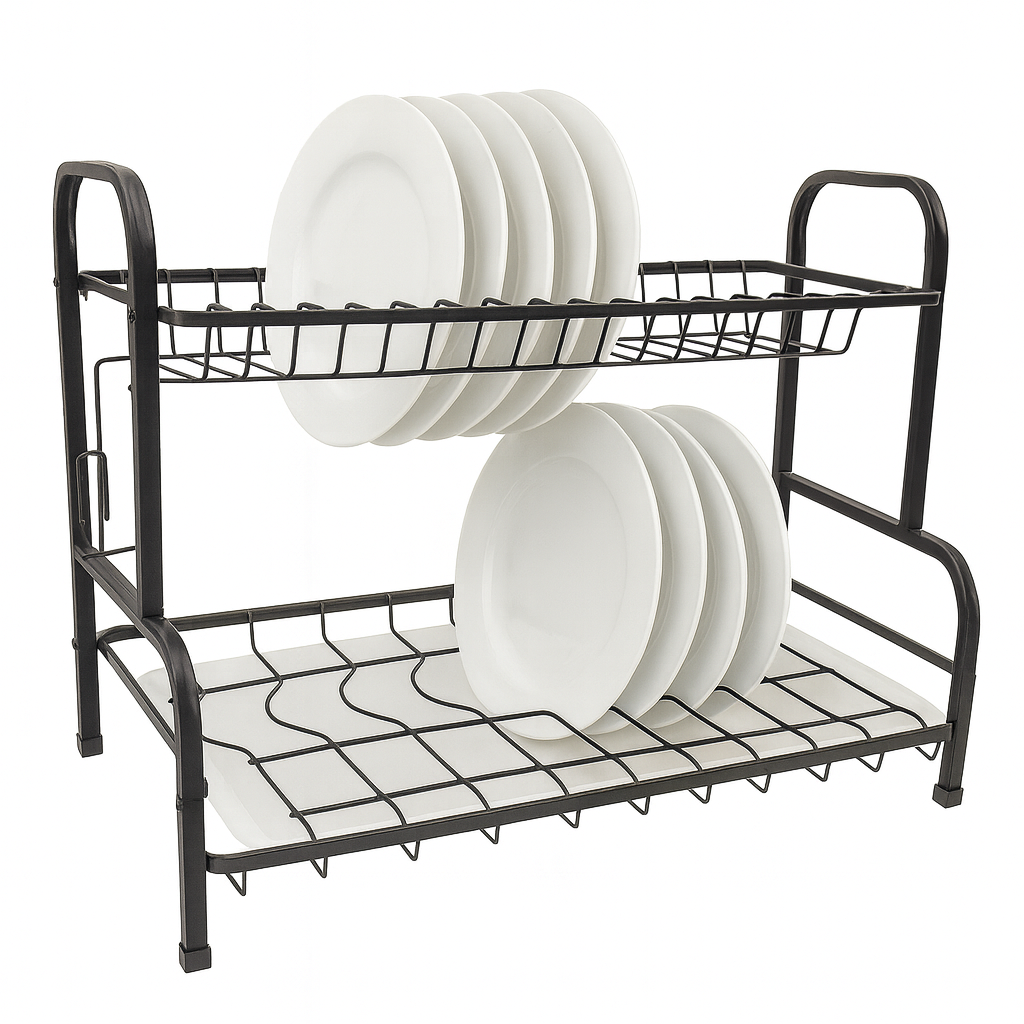 Keep your kitchen neat and efficient with this 2-Tier Metal Plate Rack Stand, designed for both drying and organizing dishes in style. Made from sturdy black-coated metal, this rack offers excellent durability and resistance to rust and moisture. The two spacious tiers provide ample room for plates, bowls, and cups, while the side hooks are perfect for hanging utensils or mugs. Its sleek, space-saving design makes it an ideal choice for modern kitchens, offering a perfect balance of functionality and aesthetics.