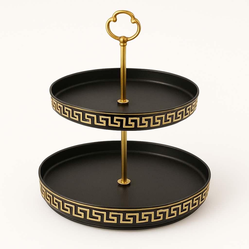 A stylish 2-tier pastry stand featuring black trays with an elegant gold Greek-key border and a gold center handle. Perfect for serving cupcakes, pastries, cookies, and snacks at parties or high-tea setups.