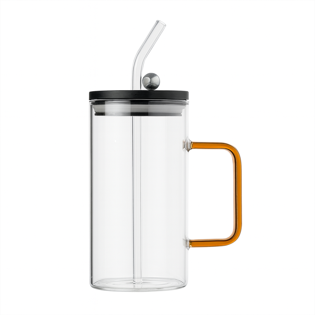 Material: Premium borosilicate glass, plastic lid, reusable straw.