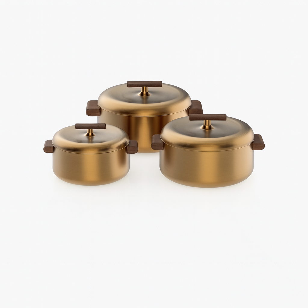 Serve and store your meals in style with this 3-Piece Stainless Steel Hot Pot Set. Designed with a luxurious gold finish and elegant wooden handles, these insulated casseroles keep food hot and fresh for hours. Perfect for family dinners, parties, or everyday use.