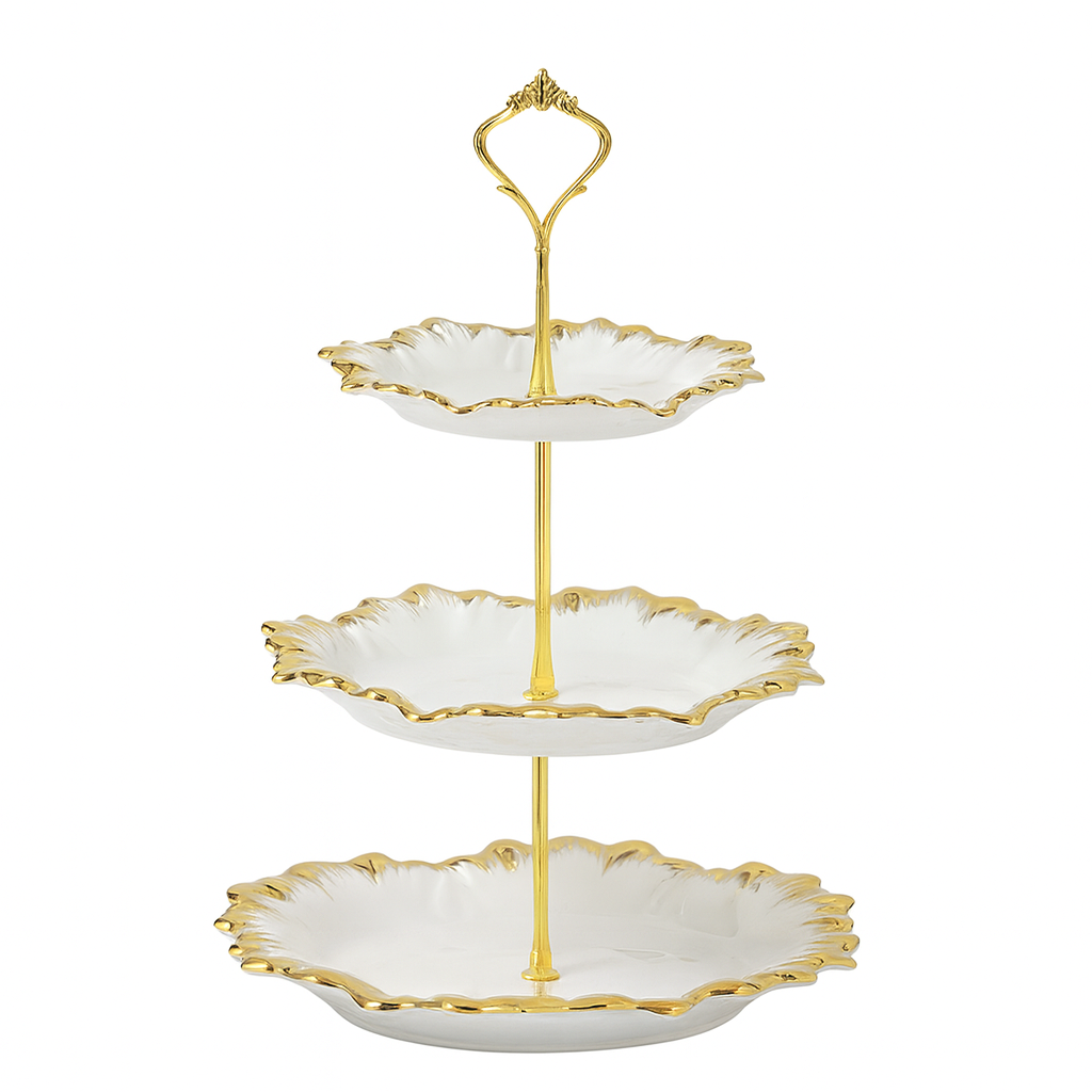 Bring charm and sophistication to your serving table with this 3-Tier Pastry Stand, designed for stylish presentation of desserts, cupcakes, and snacks. Crafted from high-quality glazed with delicate gold-trimmed scalloped edges, it’s both elegant and durable. The gold center stand and handle add a touch of luxury, making it perfect for high tea, weddings, or festive gatherings. Its tiered design allows for a visually appealing display while saving table space — a must-have for every modern host.
