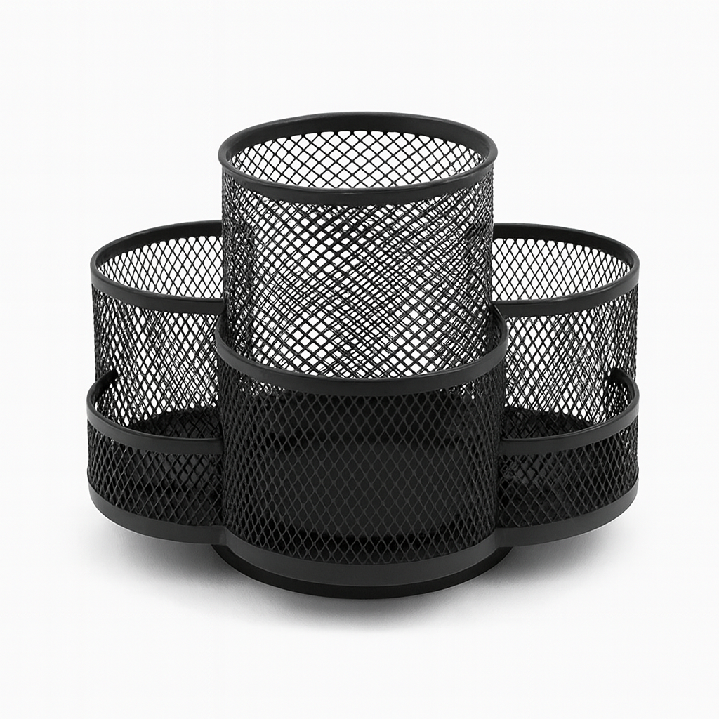 Keep your workspace tidy and efficient with this 360° Rotating Metal Stationery Holder. Designed with multiple mesh compartments and a smooth swivel base, it allows you to easily access pens, markers, scissors, clips, sticky notes, and other desk essentials. The sturdy metal build ensures long-lasting durability, while the open mesh design keeps items visible and ventilated. Perfect for office desks, study tables, classrooms, makeup stations, or craft areas, this organizer adds both style and functionality to any workspace.