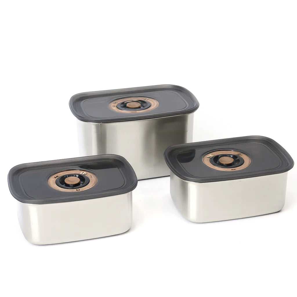 A sleek and durable solution for modern kitchens — this 3-piece stainless steel storage box set is perfect for keeping food fresh, organized, and ready to go. With stylish matte steel bodies and vacuum-seal black lids, it's a must-have for everyday use.