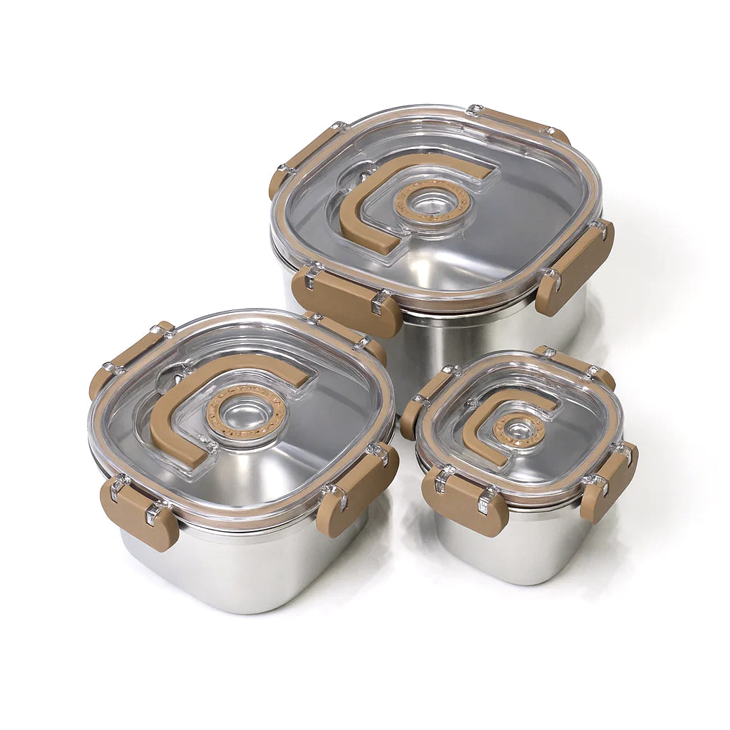 Upgrade your kitchen storage with this stylish and durable square steel storage box set, featuring clip-lock lids and vacuum valve for freshness.