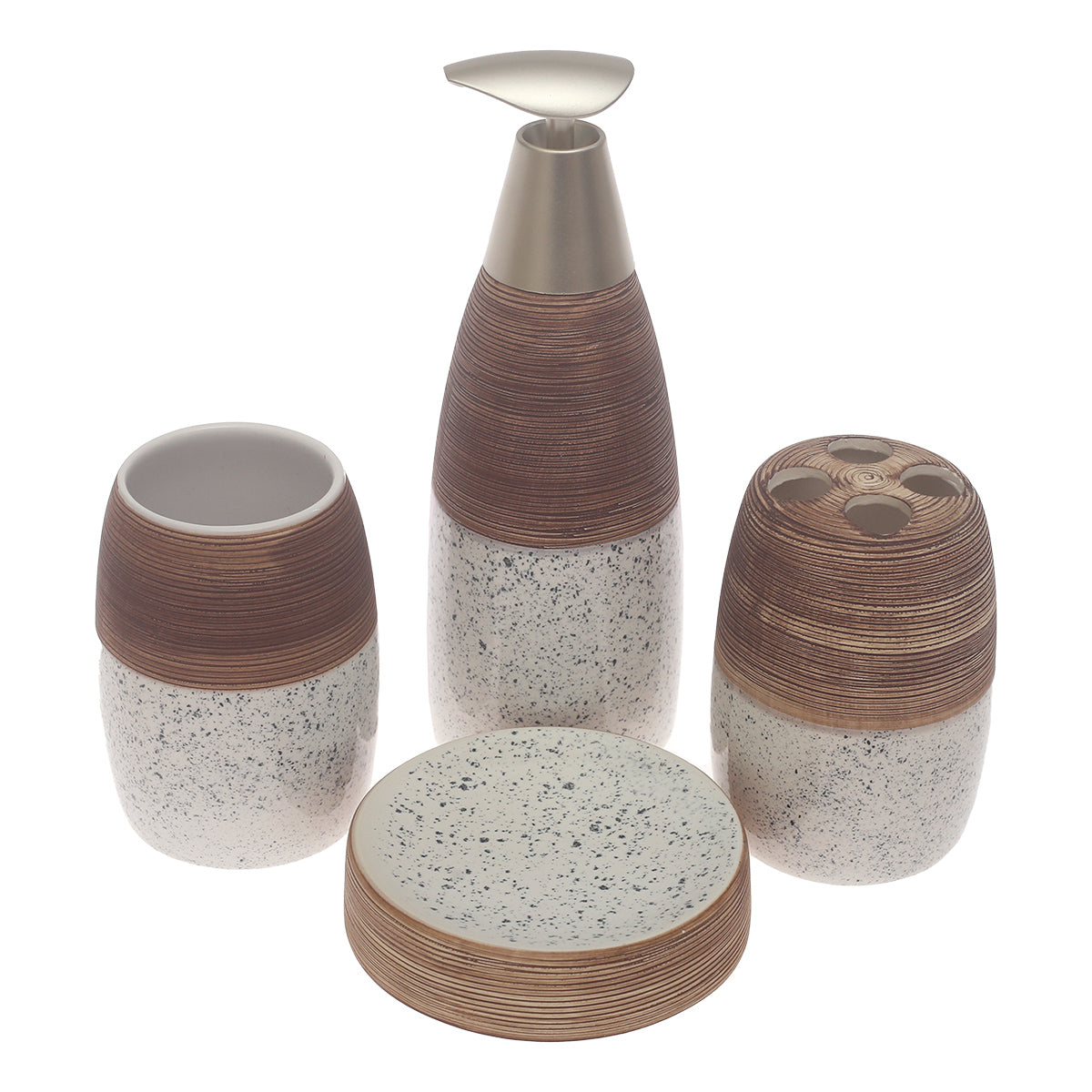 Add a contemporary, nature-inspired touch to your bathroom with this 4-piece bathroom accessory set, featuring a refined blend of textured brown detailing and a stone-speckled ceramic finish. Designed to balance elegance and practicality, this set enhances your countertop with a clean, modern aesthetic while keeping daily essentials perfectly organized. Its neutral tones make it ideal for modern, minimalist, or spa-style bathrooms.