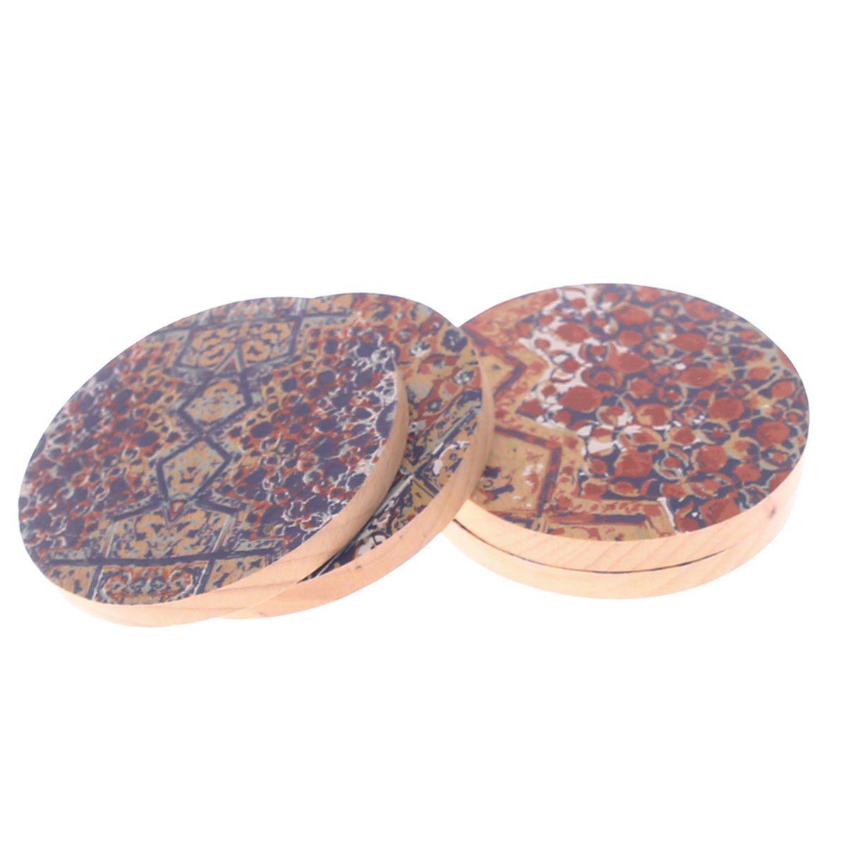 Durable base (e.g. cork, MDF, or ceramic) with printed top