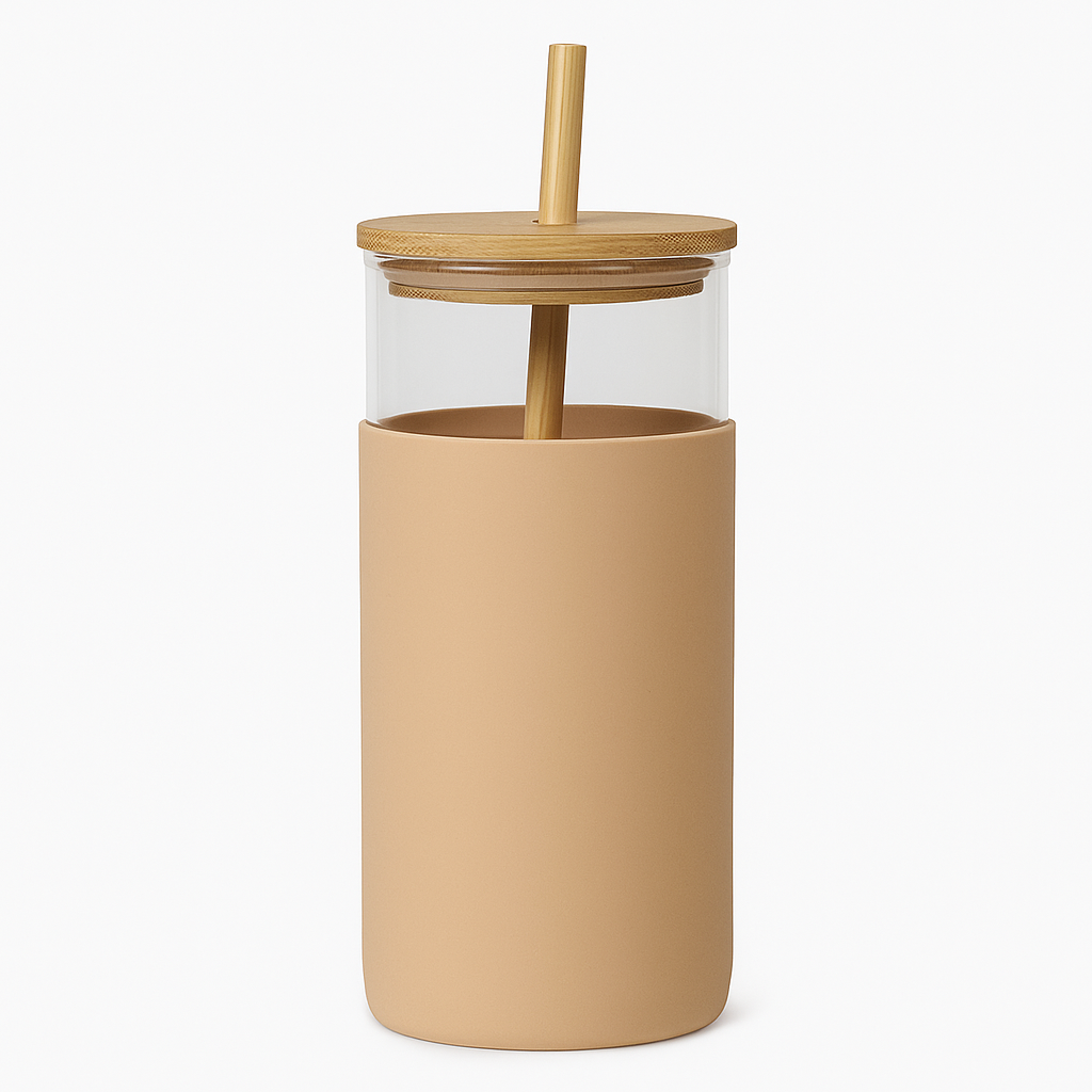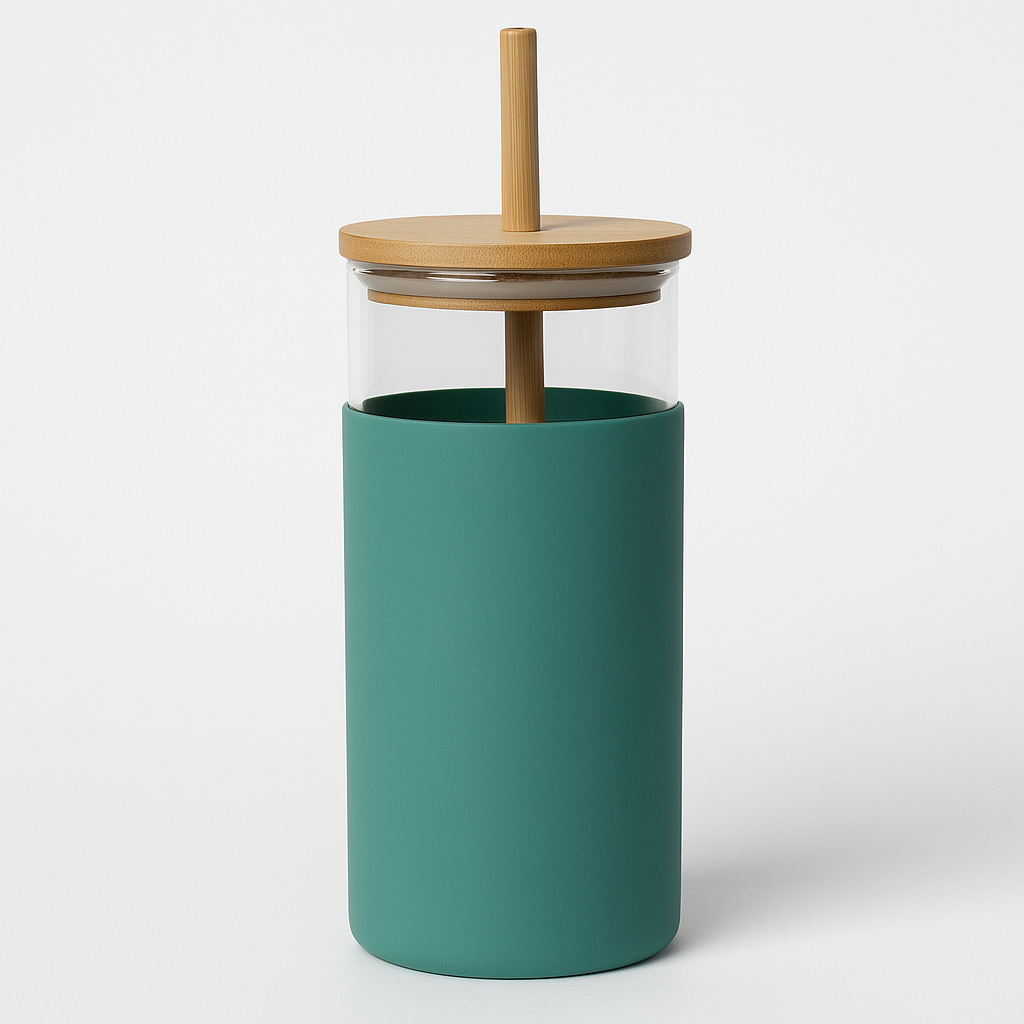 Material: Premium borosilicate glass, natural wooden lid with straw, and BPA-free silicone sleeve.
