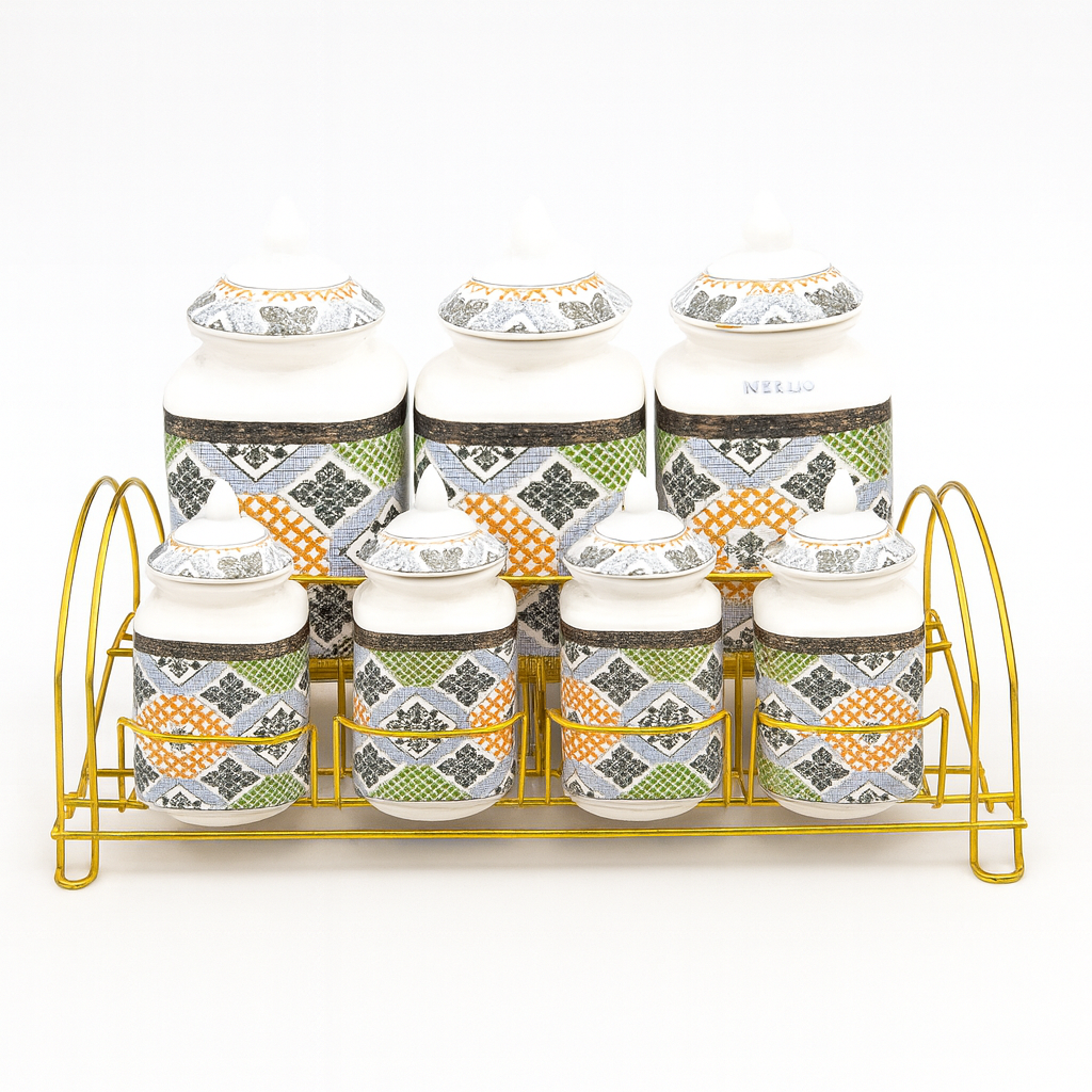 Add a vibrant touch to your kitchen with the 7 Pcs Canister Set MFG4, featuring a multicolor geometric pattern with elegant ceramic lids. Perfect for neatly storing tea, coffee, sugar, or spices while brightening up your countertop.