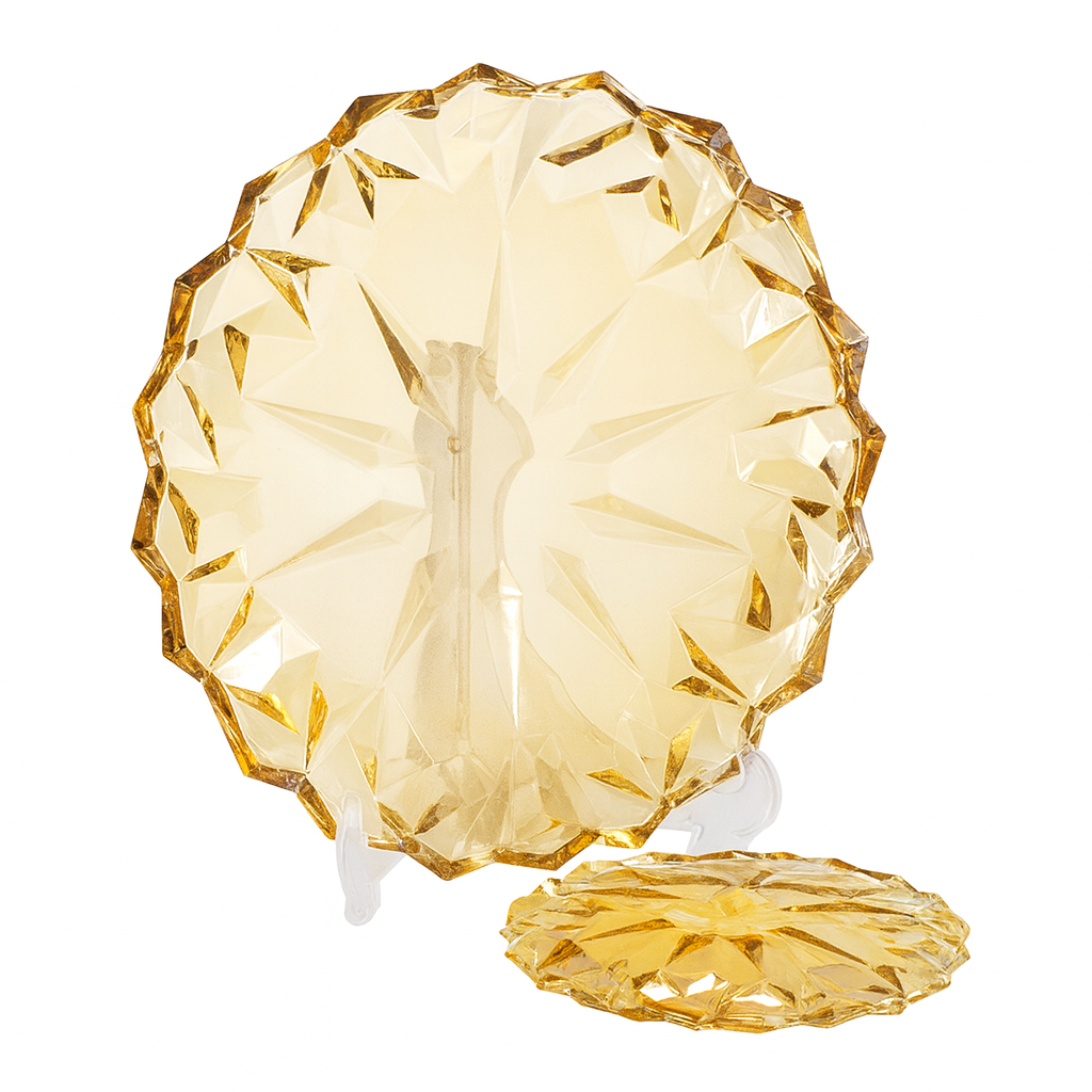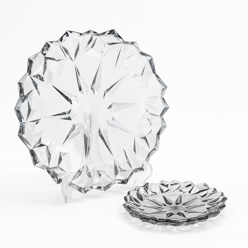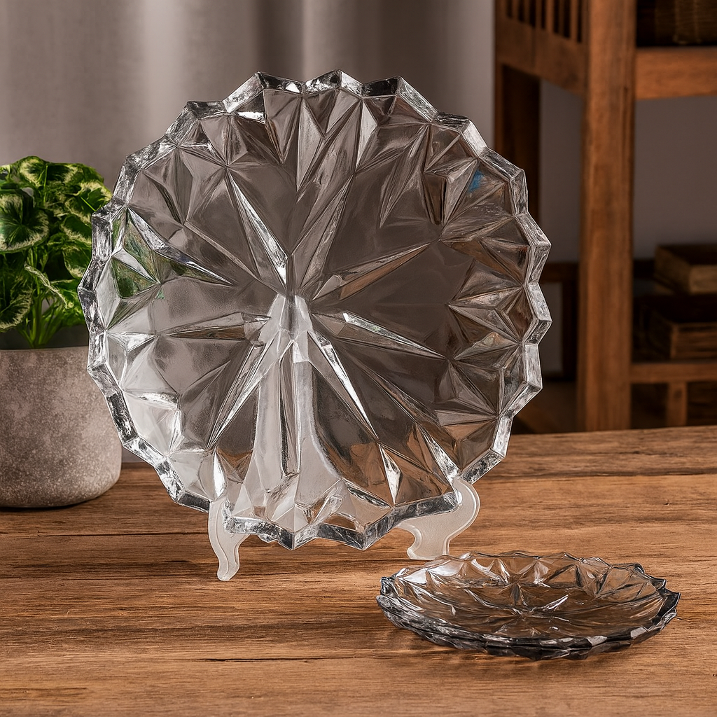 Serve desserts in style with this luxurious 7-Piece Diamond-Cut Cake Set, available in stunning gold and silver colours. Designed with a beautifully faceted crystal-look pattern, this set adds an instant touch of elegance to any table setting, making it perfect for birthdays, parties, festive gatherings and high-tea presentations.