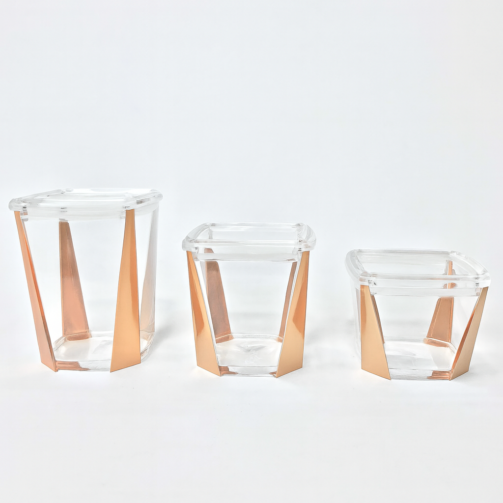 Upgrade your storage style with the Acrylic Jar Single Piece, available in small, medium, and large sizes. Designed with a crystal-clear acrylic body and accented with a chic rose gold geometric design, these jars add a touch of luxury to everyday storage. Perfect for dry fruits, candies, chocolates, nuts, or even as decorative containers, they make an excellent addition to modern kitchens, dining tables, or festive hampers.