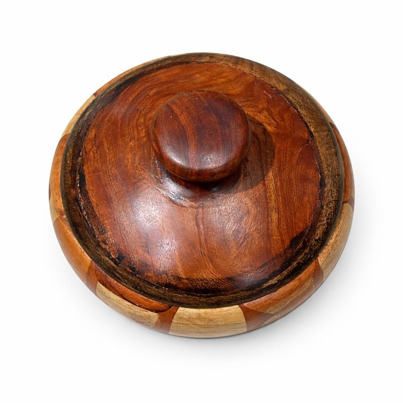 Expertly crafted from high-quality natural wood, this antique-style pot is hand-finished to highlight its unique grain patterns and contrasting wood panels. Suitable for storing dry items such as spices, grains, potpourri, or keepsakes, and equally perfect as a decorative statement piece on shelves, sideboards, or tables.