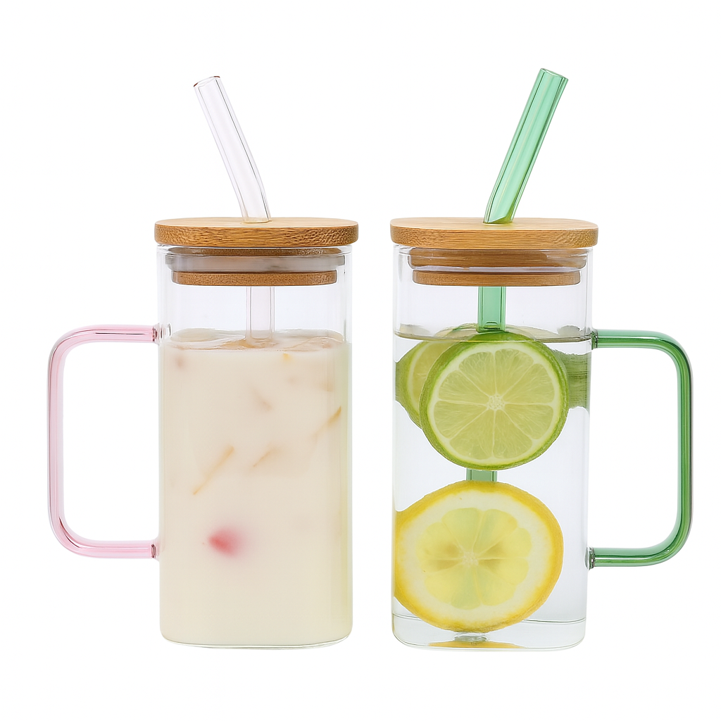 Sip in style with this elegant assorted glass tumbler featuring a matching reusable straw and eco-friendly bamboo lid. Designed for modern lifestyles, this tumbler is perfect for iced coffee, smoothies, juices, or infused water. The crystal-clear glass highlights your drink beautifully, while the color-accented handle and straw add a touch of fun and personality.