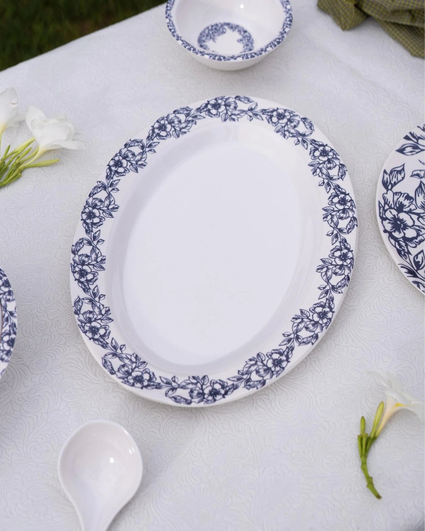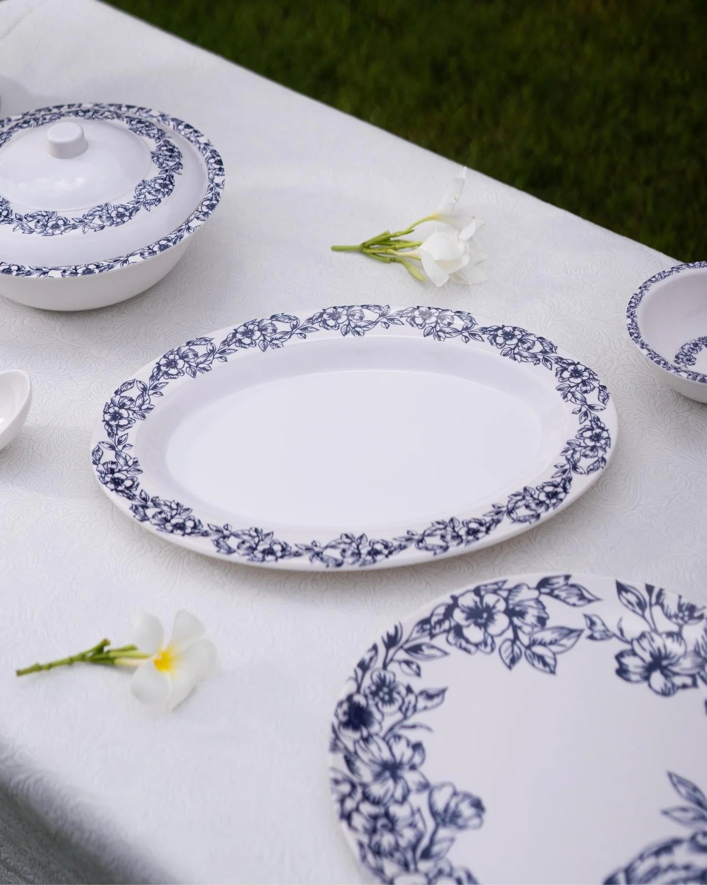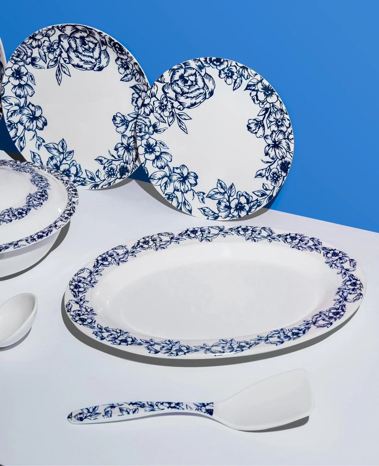 Bring classic charm and graceful beauty to your dining table with the Azure Blossom Dinner Set. Inspired by traditional porcelain aesthetics, this elegant collection features delicate deep-azure floral patterns set against a crisp white background. The refined design creates a sophisticated yet welcoming table setting, perfect for both everyday meals and special gatherings. Part of our premium melamine series, Azure Blossom combines timeless style with modern durability for effortless, elegant dining.