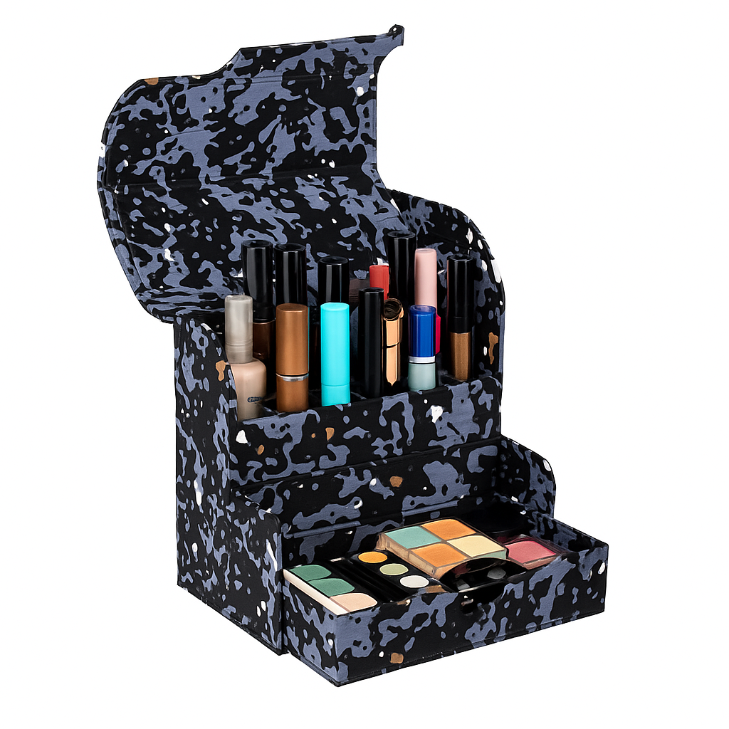 A bold black camouflage-style organizer designed to keep foundations, lipsticks, mascaras and palettes neatly arranged. Features upper compartments for daily items and a spacious pull-out drawer for powders, shadows and small accessories.