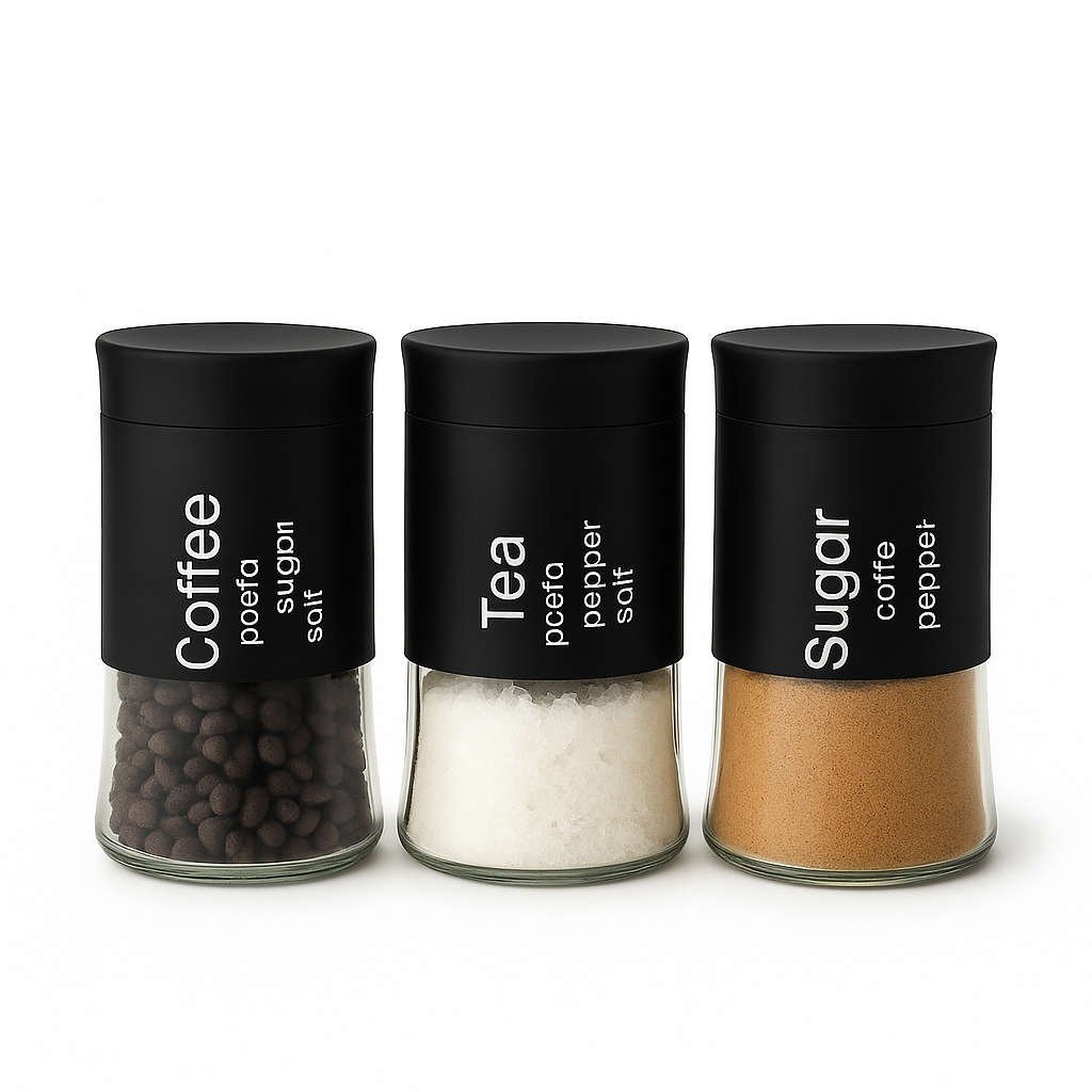 A sleek and modern 3-piece glass jar set with Black stainless-steel lids, perfect for neatly storing tea, coffee, sugar, spices, or dry ingredients. Adds a touch of elegance and organization to any kitchen counter or pantry.