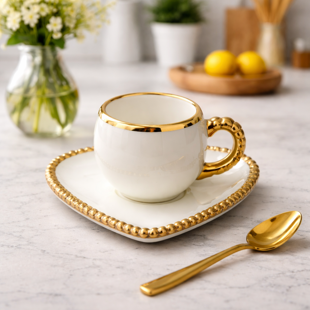 Ceramic Heart Shaped Cup & Saucer Set 100ML – Small Tea & Coffee Cup A charming ceramic heart-shaped cup and saucer set designed for elegant tea and coffee serving. With a small 100ML capacity, this set is perfect for espresso, tea, or decorative table settings. The heart design adds a romantic and premium touch, ideal for gifting or personal use.