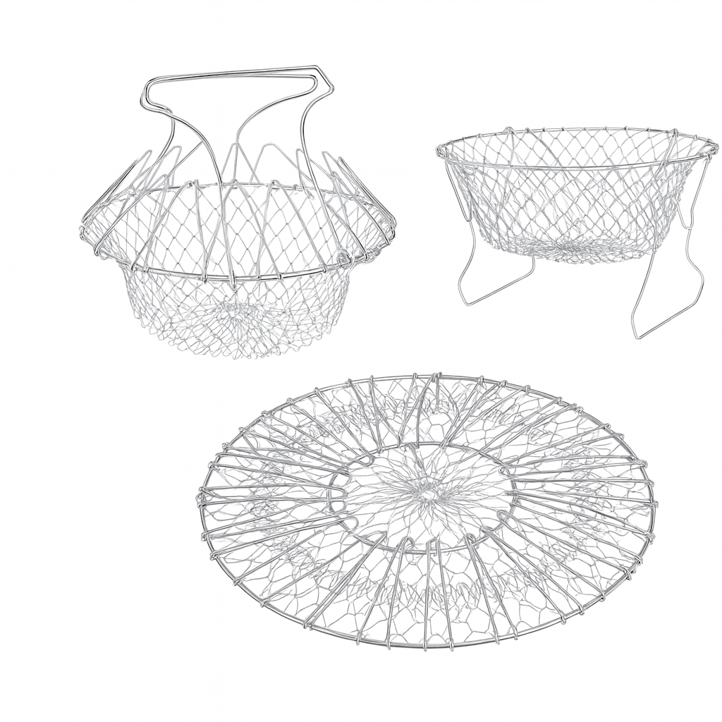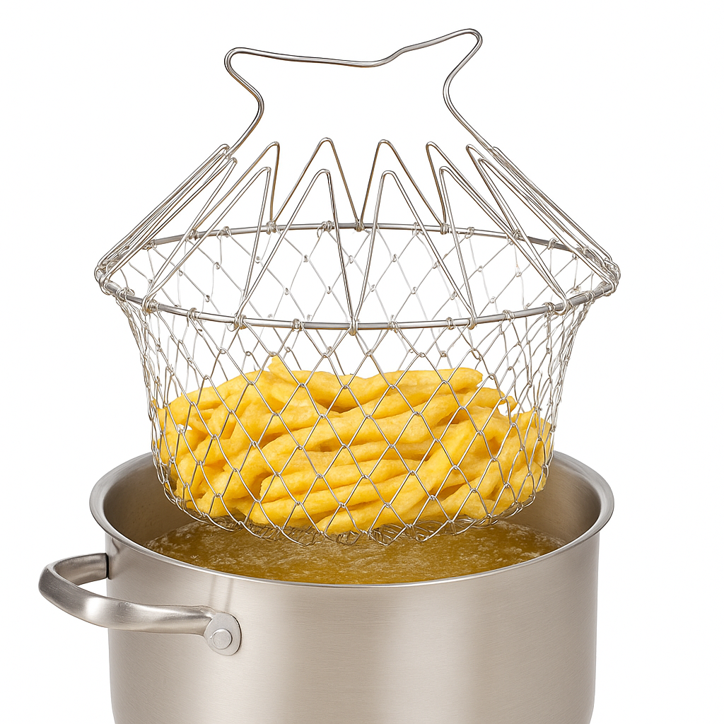 Cook like a pro with this multi-purpose Chef Basket! Its foldable stainless steel design lets you easily fry, boil, steam, or strain food. Simply lift the basket to drain hot oil or water—no spills or mess. Perfect for pasta, fries, veggies, and more.