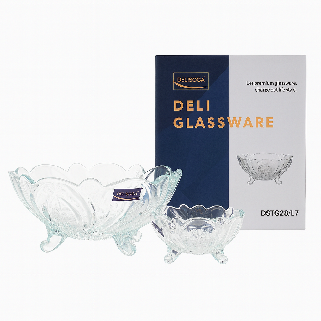 Elevate your serving experience with this beautifully designed 7-piece clear pressed-glass fruit bowl set, featuring an ornate floral-embossed pattern and elegant footed bases. The decorative detailing sparkles under light, giving every table setting a refined and luxurious touch. Perfect for serving fruits, desserts, sweets, nuts or snacks, this set blends timeless charm with everyday practicality—ideal for home dining, festive entertaining, cafés or gifting.