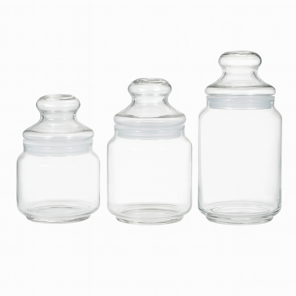 Each jar includes a fitted glass lid to help maintain freshness and prevent moisture entry.