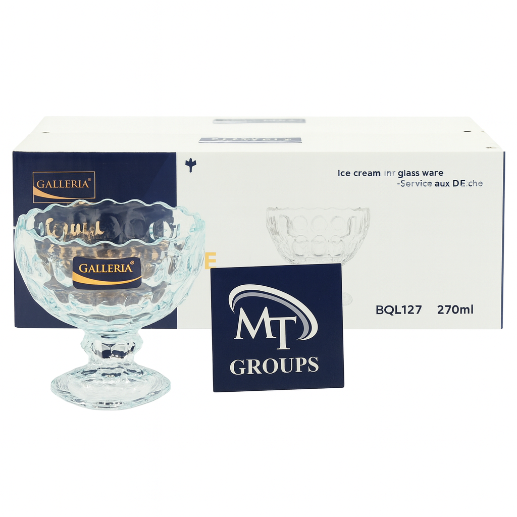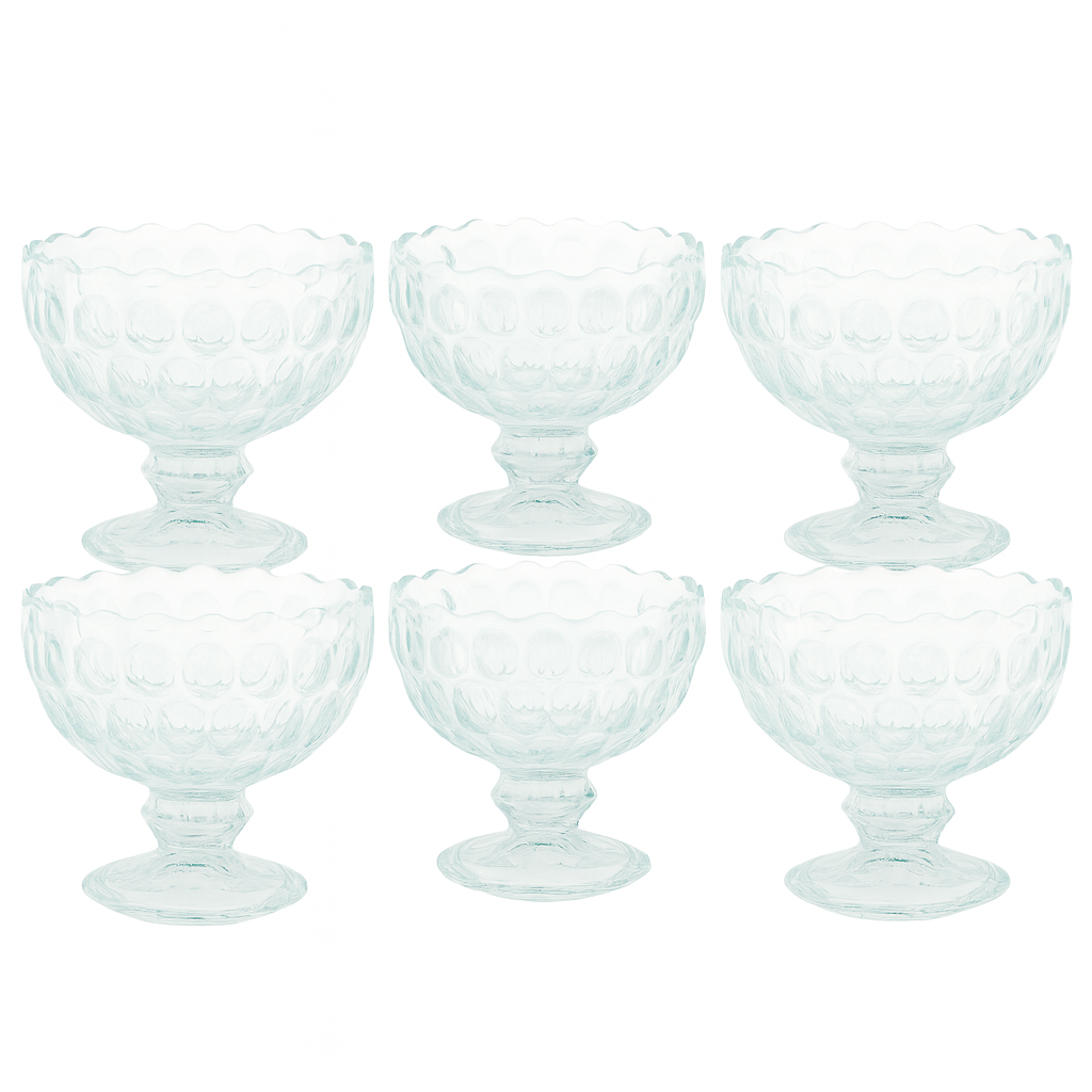 Serve your favourite chilled desserts in style with this elegant 6-piece set of 210 ml clear glass ice cream cups, crafted with a beautifully scalloped bowl and sturdy footed base. The embossed pressed-glass design adds sparkle and sophistication, making each serving look luxurious—perfect for home entertaining, cafés, dessert bars or festive gatherings.