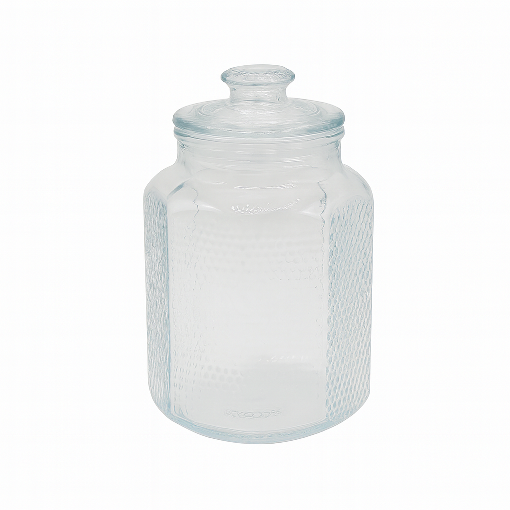 Keep your pantry neat, clean and stylish with this 2200 ml clear glass storage jar, designed with a fine textured pattern that gives it a refined, premium look. The thick, high-clarity pressed glass ensures durability while beautifully showcasing the contents inside. Complete with a matching fitted lid, this jar keeps your dry goods fresh and organised—perfect for kitchens, cafés, offices and decorative storage.