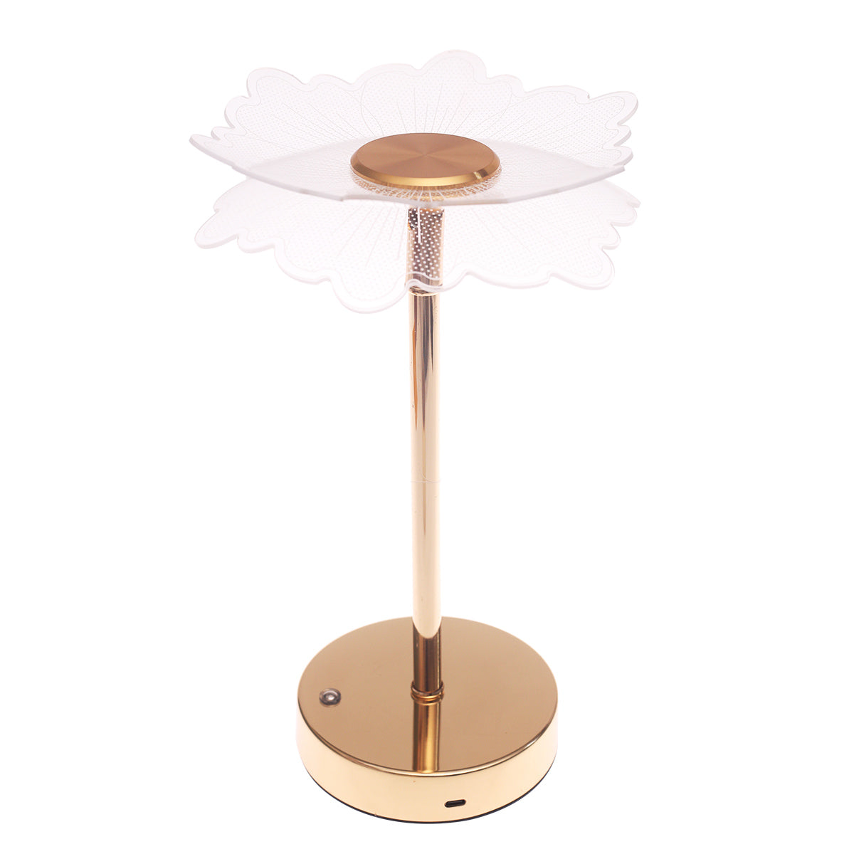 Bring refined elegance and contemporary charm to your interiors with this Small Gold Console Piece Decorative Accent Lamp. Standing at 14 inches tall, this unique piece showcases a graceful floral-inspired design crafted with translucent layered detailing that softly diffuses light. The sleek gold-tone metal stem and base add a luxurious finish, while the sculptural form makes it a striking visual centerpiece even when not illuminated.