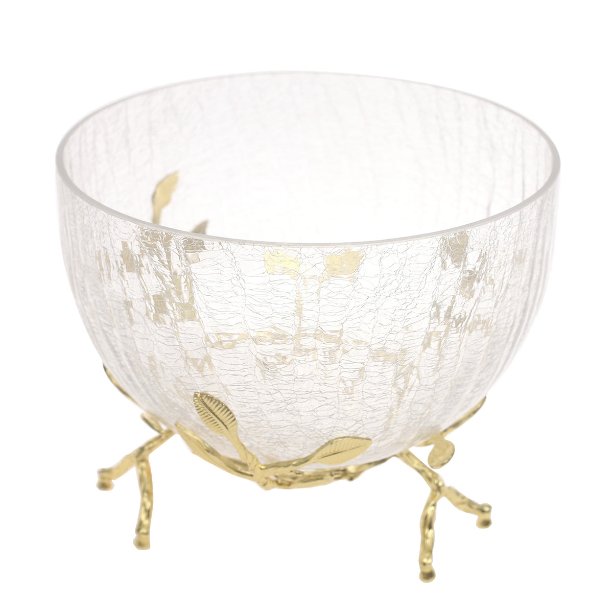 Add refined sophistication to your décor with this Small Gold Console Piece Decorative Bowl, thoughtfully designed to elevate compact spaces. Featuring a beautifully textured clear glass bowl with a crackle-style finish, this piece rests on an artistic gold-tone metal base inspired by natural branches and delicate leaf detailing. The combination of transparent glass and warm gold accents creates a timeless, luxurious look.