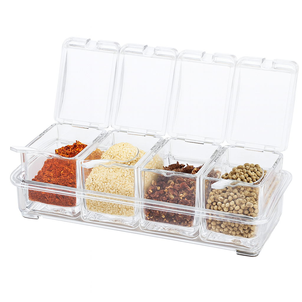 Keep your spices fresh and your kitchen organized with this Crystal Seasoning Box. Featuring 4 individual compartments with clear flip-top lids, this spice organizer allows you to neatly store and access different seasonings, herbs, or condiments in one place. Its transparent design makes it easy to identify contents at a glance, adding both functionality and elegance to your kitchen.
