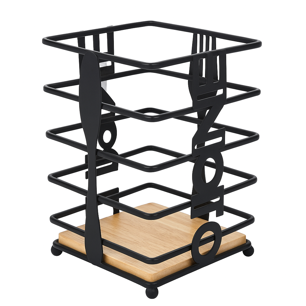 Cuisine Art Spoon Holder Wooden Base A sleek, modern spoon holder featuring a matte-black metal frame with utensil cut-outs and a sturdy wooden base—perfect for organizing spoons and cooking tools.