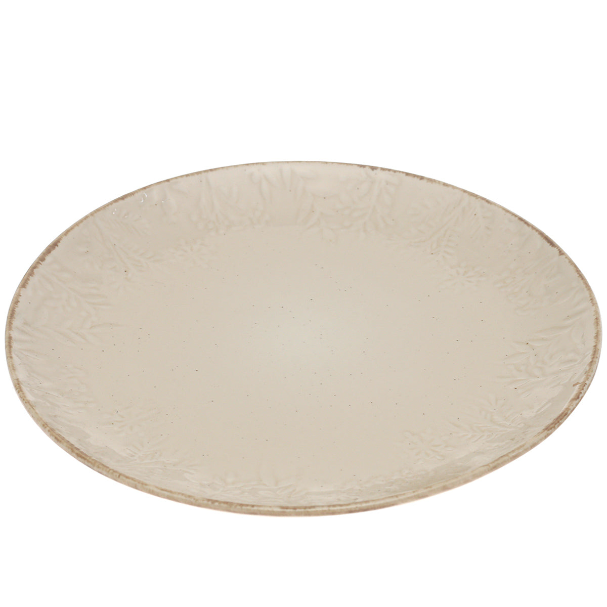Add a refined touch to your table with this 10.5-inch beige ceramic dinner plate, beautifully designed with a subtle embossed floral pattern along the rim. The soft neutral glaze, paired with delicate speckling and a gently distressed edge, creates a warm, artisanal look that enhances both everyday meals and special occasions. Its spacious surface is ideal for serving main courses, pasta, rice dishes, or plated desserts, making it a versatile essential for modern and classic dining settings alike.