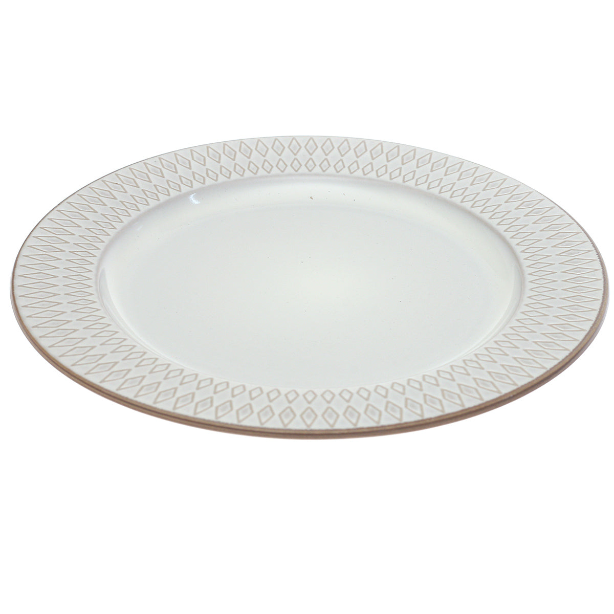 Refine your dining experience with this elegant 10.5-inch white ceramic dinner plate, designed to bring timeless sophistication to any table setting. Featuring a clean white glazed center framed by a subtle geometric patterned rim in a soft neutral tone, this plate offers a perfect balance of modern design and classic appeal. Its understated detailing enhances food presentation, making it ideal for everyday meals, formal dinners, and restaurant-style plating. A versatile essential that pairs effortlessly with both contemporary and traditional dinnerware collections.