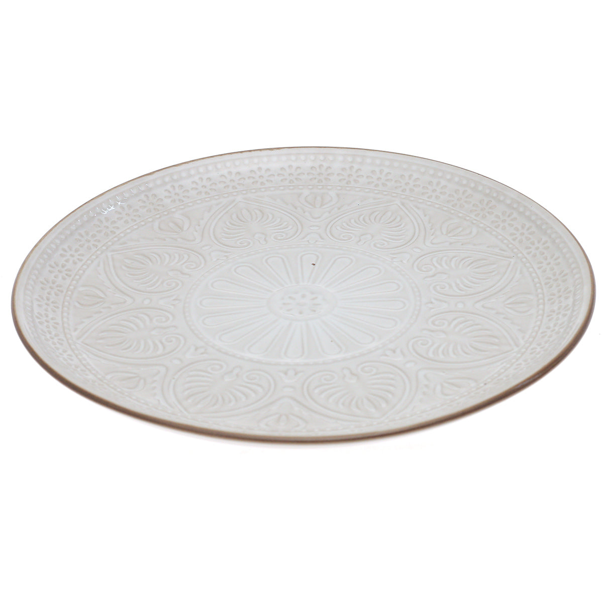 Elevate your table setting with this beautifully crafted 10.5-inch white ceramic dinner plate, designed with intricate embossed detailing that adds timeless elegance to any meal. Featuring a soft white glaze with ornate ornamental patterns and a gently distressed rim, this plate brings a refined, artisanal charm to both everyday dining and special occasions. The subtle texture enhances food presentation, making it ideal for main courses, pasta, rice dishes, or elegant plated servings. A versatile addition that complements classic, rustic, and contemporary tableware collections.