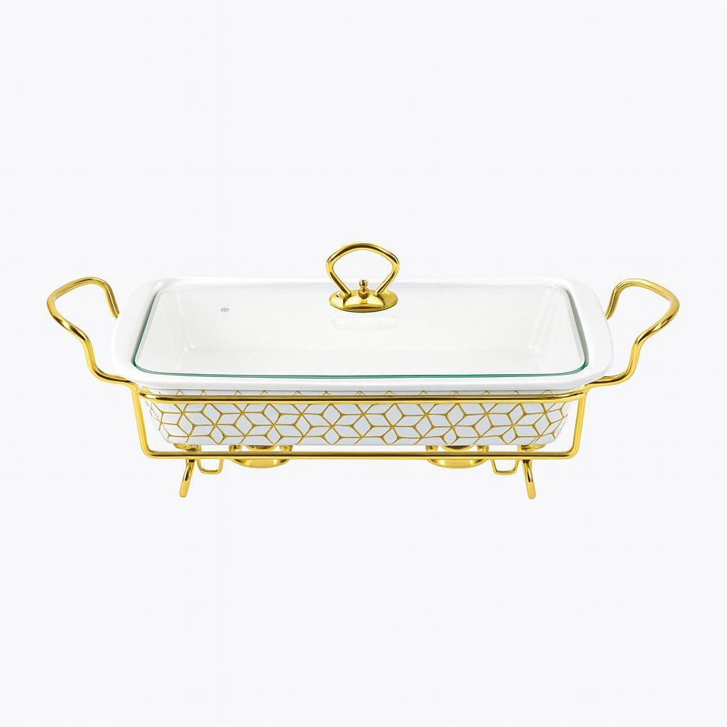 Elegant 11" Ceramic Casserole With Gold Metal Stand – Premium Serving & Warming Dish This casserole set features a high-quality ceramic dish paired with a beautifully crafted gold metal stand. Designed for stylish serving and efficient heat retention, it’s perfect for presenting biryani, curries, pasta, desserts, and party dishes. The glass lid helps keep food warm while enhancing the overall presentation for family meals or special gatherings.
