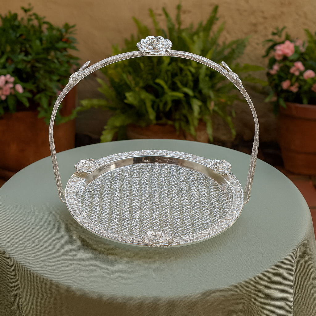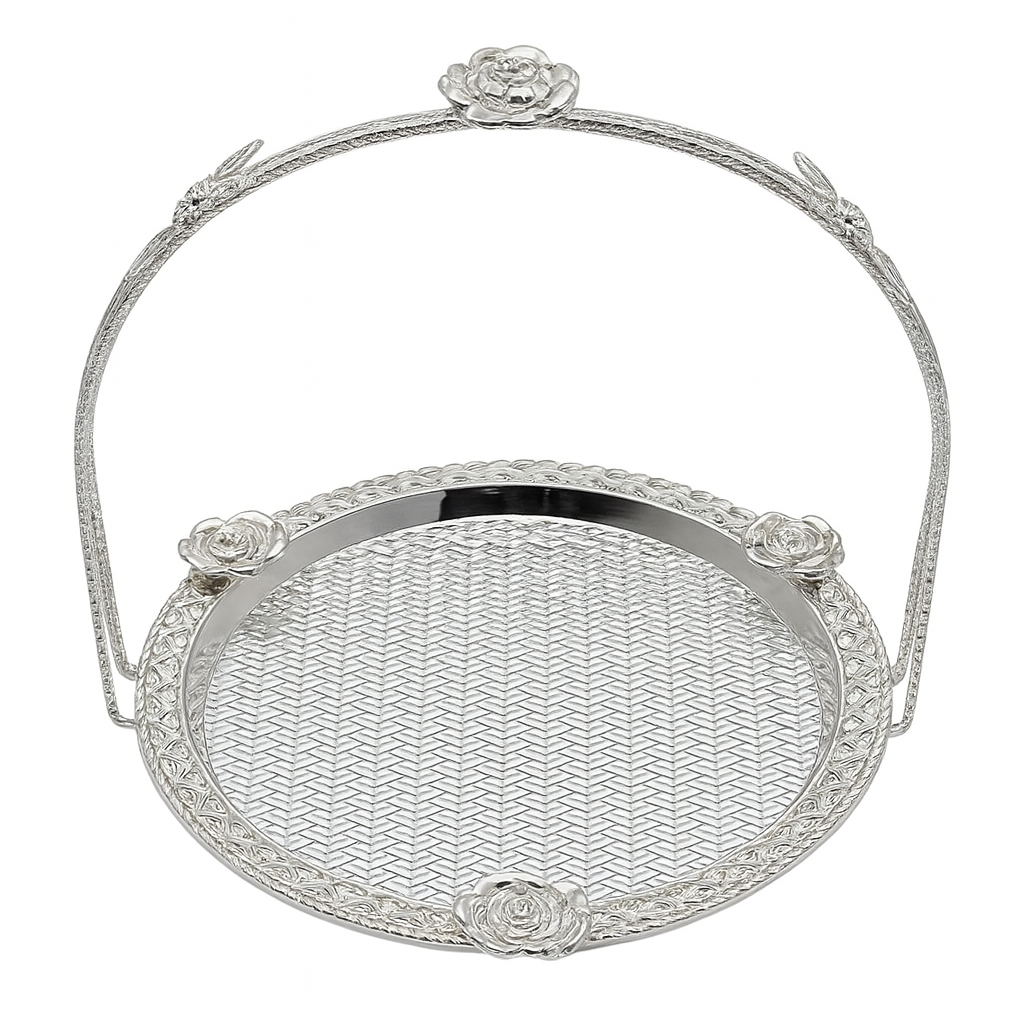 Bring elegance and charm to your table or home décor with this Small Silver Floral Round Basket, beautifully crafted with intricate floral detailing and a delicately patterned base. The raised handle, adorned with sculpted roses, adds a graceful touch while making the basket easy to carry and display.
