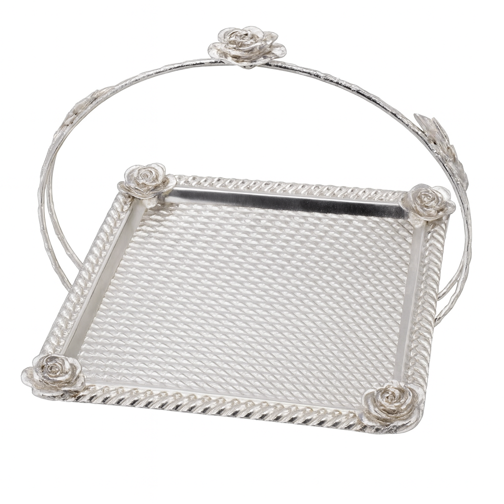 Enhance your table décor with this elegant Small Silver Floral Square Basket, beautifully designed with ornate rose accents at each corner and along the curved handle. The textured, woven-look base adds depth and sophistication, while the sturdy metal frame provides both style and stability.