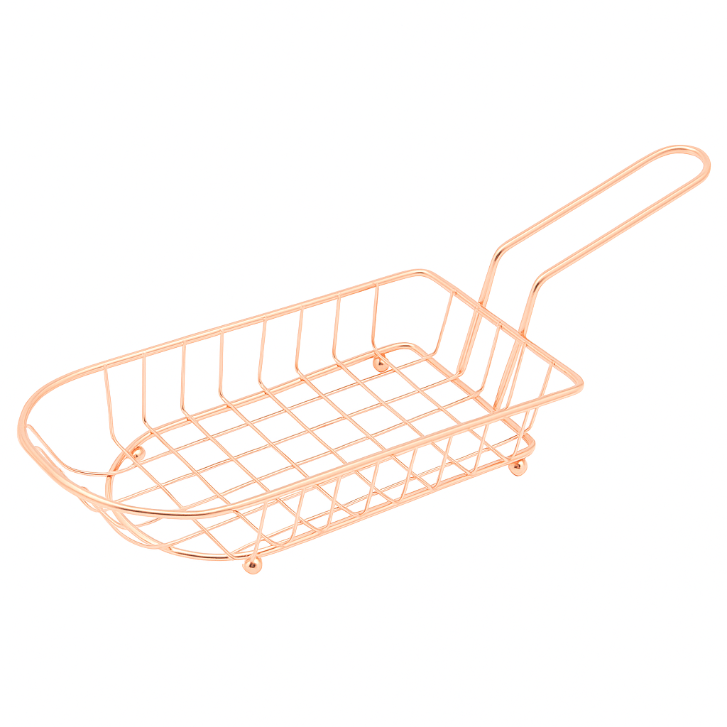 Fries Strainer Boat – Wire Basket with Handle (Silver & Copper Options) Serve fries, snacks, and finger-foods in style with this boat-style wire basket featuring a long handle for easy carrying and dipping. Available in both sleek silver and warm copper finishes, it adds a modern, restaurant-chic touch to your table.