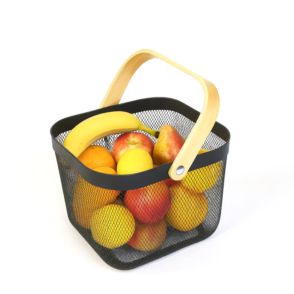A versatile and durable fruit basket featuring a mesh body with a natural bamboo handle. Available in black, this basket is perfect for storing and serving fruits, vegetables, or bread while keeping them fresh. Its lightweight yet sturdy build makes it a practical choice for both kitchen counters and dining tables, adding a modern touch to your home décor.