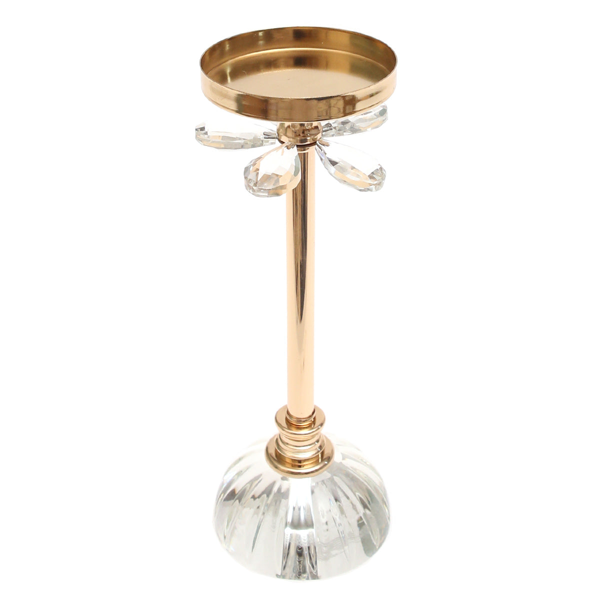 Crafted from gold-finished metal with crystal-style accents and a solid glass base. Ideal for holding pillar candles and enhancing ambient lighting in luxurious interior settings.
