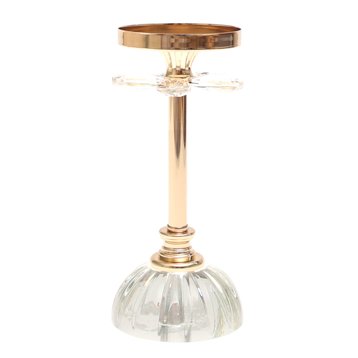 Crafted from gold-finished metal with crystal-style accents and a solid glass base. Ideal for medium pillar candles and decorative styling in modern, classic or luxe interiors.