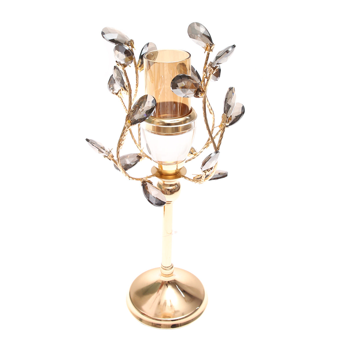 Made from premium gold-finished metal, grey cut crystals and a tinted glass candle enclosure. Ideal for pillar candles and upscale home styling.