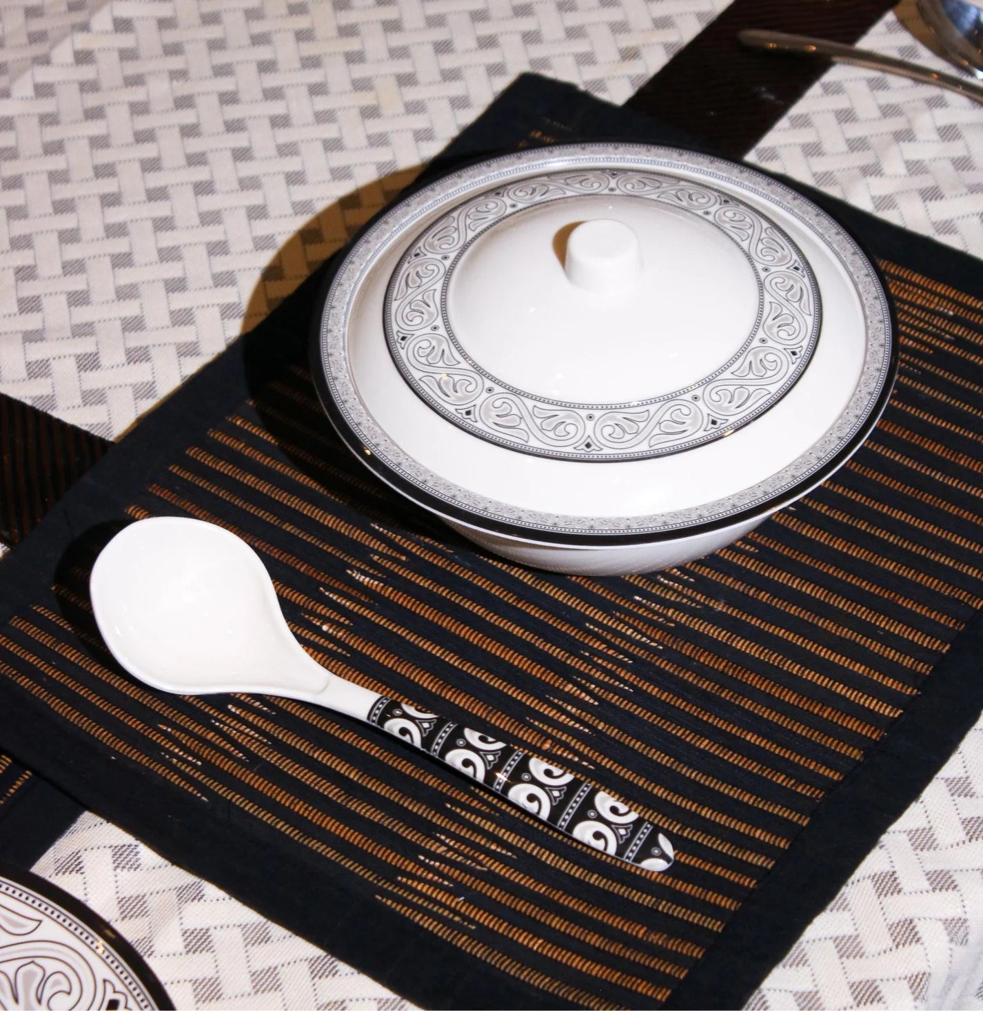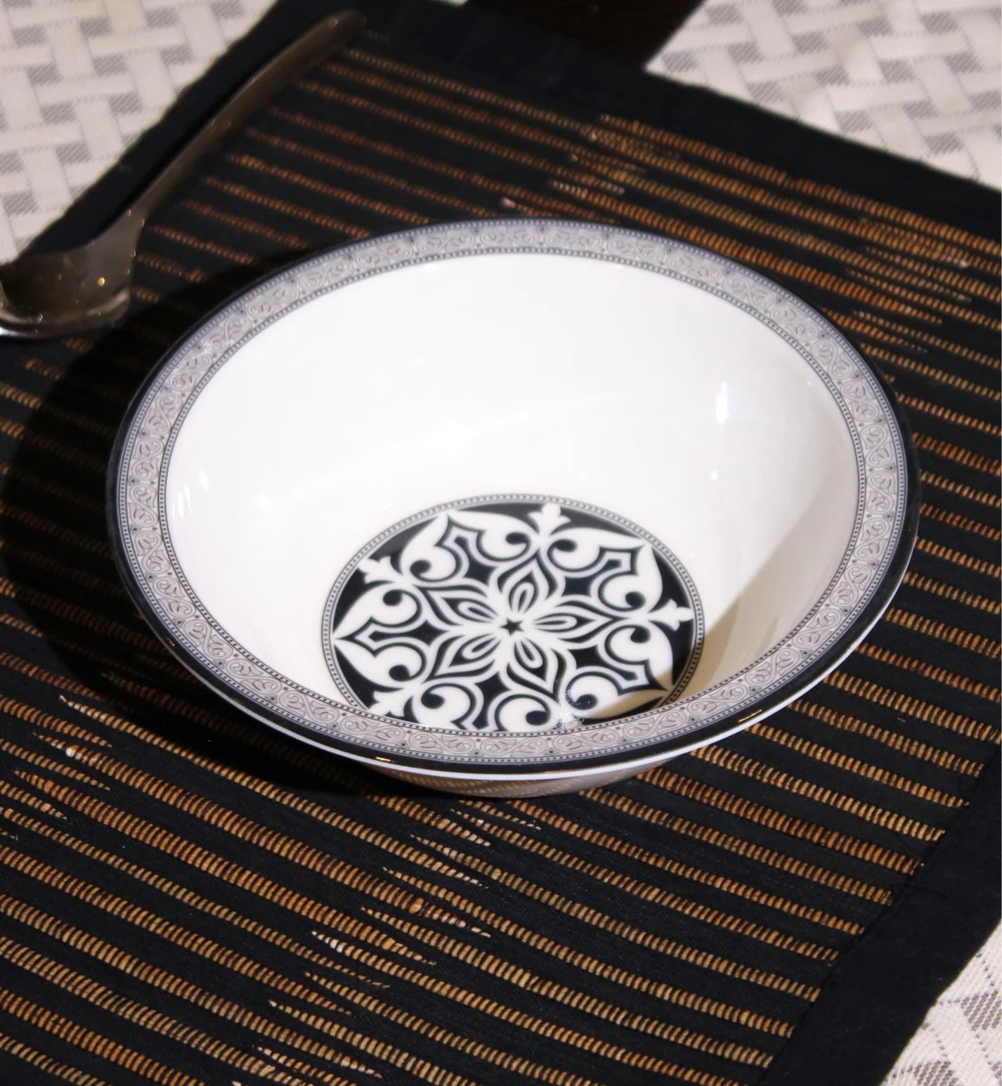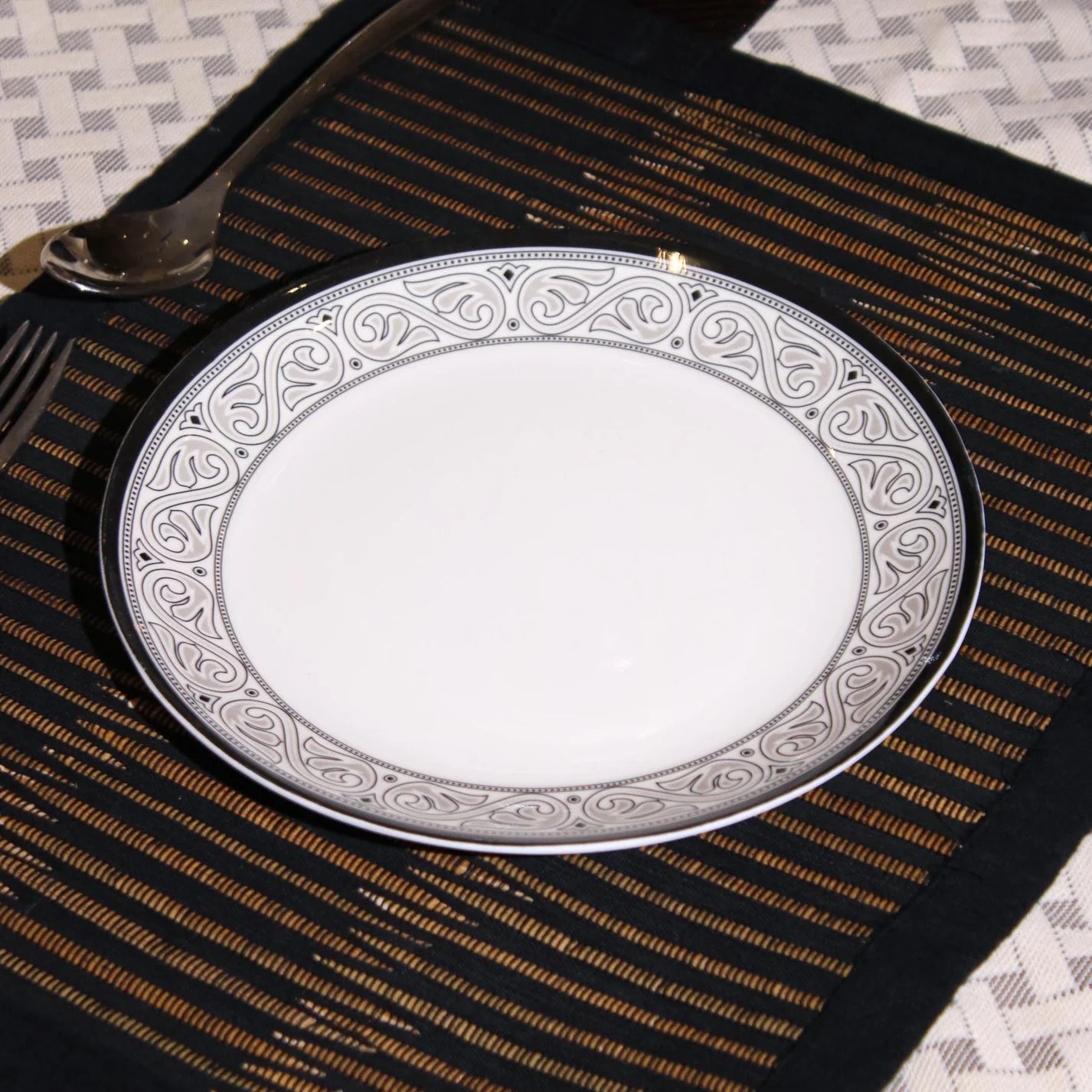 Make a powerful style statement with the Gothic Grace Dinner Set, a striking blend of classic ornamentation and modern sophistication. Featuring intricate black gothic-inspired motifs framed by elegant borders on a crisp white base, this collection transforms your table into a refined visual experience. Designed for those who appreciate bold aesthetics with timeless appeal, Gothic Grace is perfect for both everyday dining and special occasions.