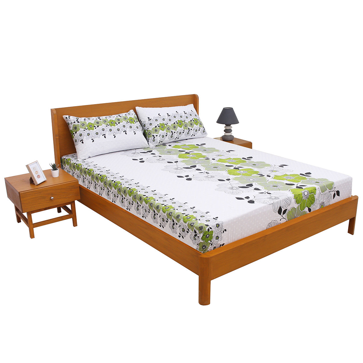 Infuse freshness and elegance into your bedroom décor with this Green & White Floral Double Bed Sheet (Design E). Featuring a stylish arrangement of green, black, and white flowers on a soft white background, this bed sheet adds a modern yet soothing vibe to your space. Made from smooth, breathable fabric, it offers exceptional comfort, long-lasting durability, and effortless sophistication — ideal for daily use or to elevate your guest room décor.