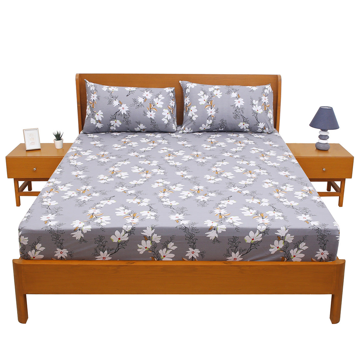 Add a touch of elegance and calm to your bedroom with this Grey with White Floral Double Bed Sheet (Design E). Showcasing a soothing grey base adorned with delicate white flowers and subtle green and mustard accents, this design beautifully balances simplicity and sophistication. Made from soft, breathable fabric, it ensures all-night comfort while enhancing the look of your bedroom décor. Perfect for daily use or as a thoughtful gift, this bed sheet brings a refreshing floral charm to any home.