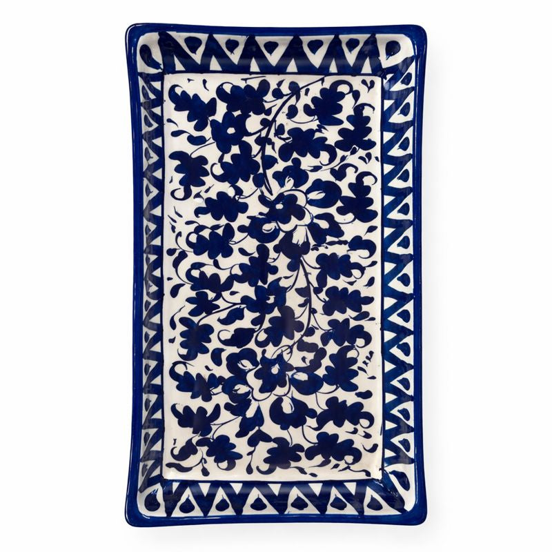 Add refined elegance to your serving and décor with this Handcrafted Blue Pottery Rectangle Platter. Showcasing intricate hand-painted floral motifs in classic cobalt blue on a soft ivory base, this platter reflects the timeless beauty of traditional blue pottery craftsmanship. Its sleek rectangular form and raised edges make it ideal for presenting snacks, starters, desserts, sweets, or dry treats, while its artistic detailing allows it to double beautifully as a decorative accent for tables, consoles, or shelves.