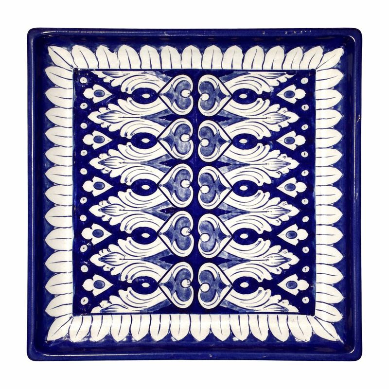 Enhance your dining and décor with this Handcrafted Blue Pottery Medium Serving Dish, a striking piece rooted in traditional craftsmanship. Featuring a bold cobalt-blue base adorned with intricate white hand-painted motifs and framed by a classic patterned border, this square dish reflects the timeless beauty of Jaipur’s blue pottery art. Perfectly sized for versatile use, it is ideal for serving snacks, starters, sweets, dry fruits, or festive treats, while also making a beautiful decorative accent for tables, consoles, or display shelves.